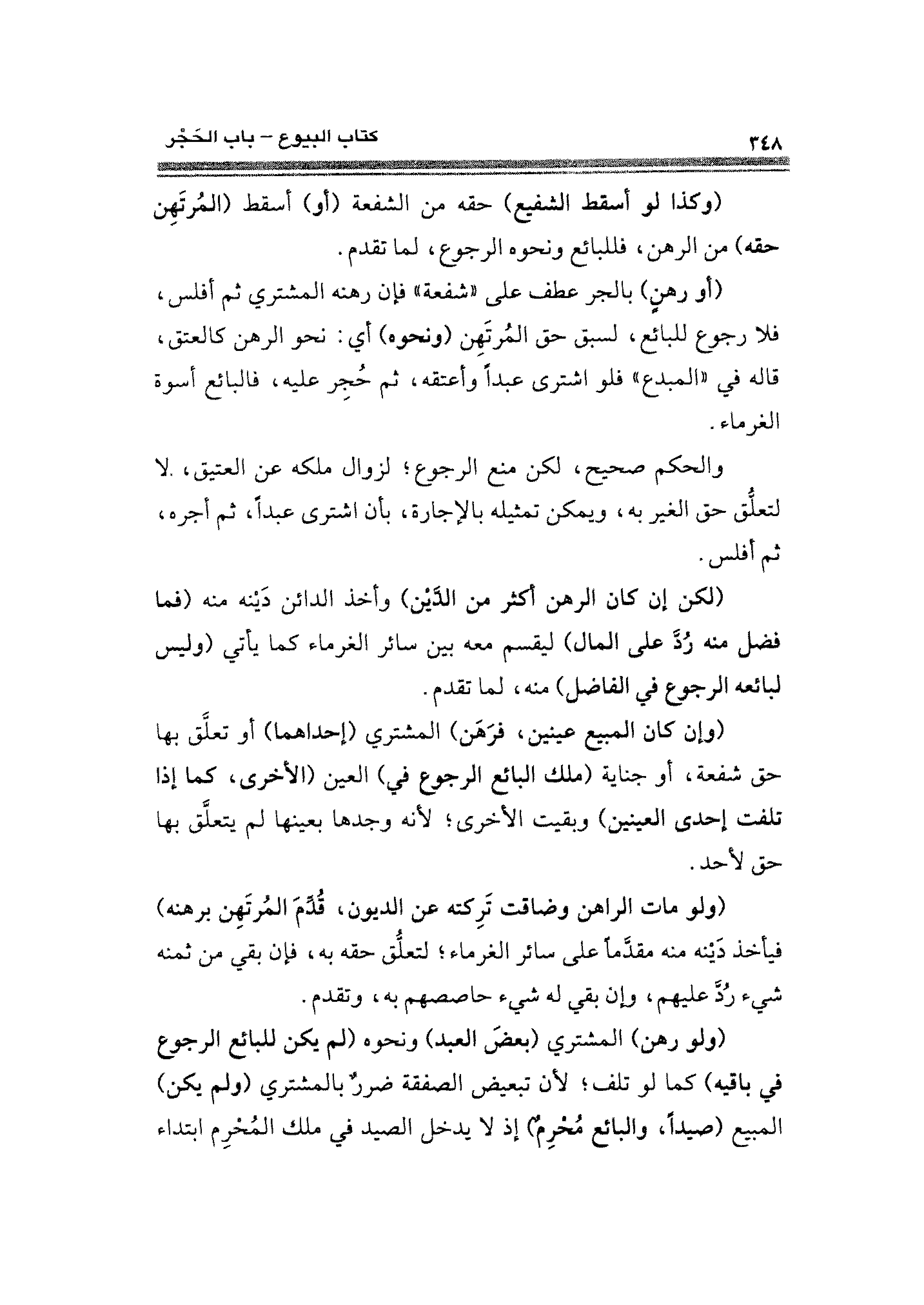 (أو رهنٍ) بالجر عطف على "شفعة" فإن رهنه المشتري ثم أفلس، فلا رجوع للبائع، لسبق حق المُرتَهِن (ونحوه) أي: نحو الرهن كالعتق، قاله في "المبدع" فلو اشترى عبدًا وأعتقه، ثم حُجِر عليه، فالبائع أسوة الغرماء.
