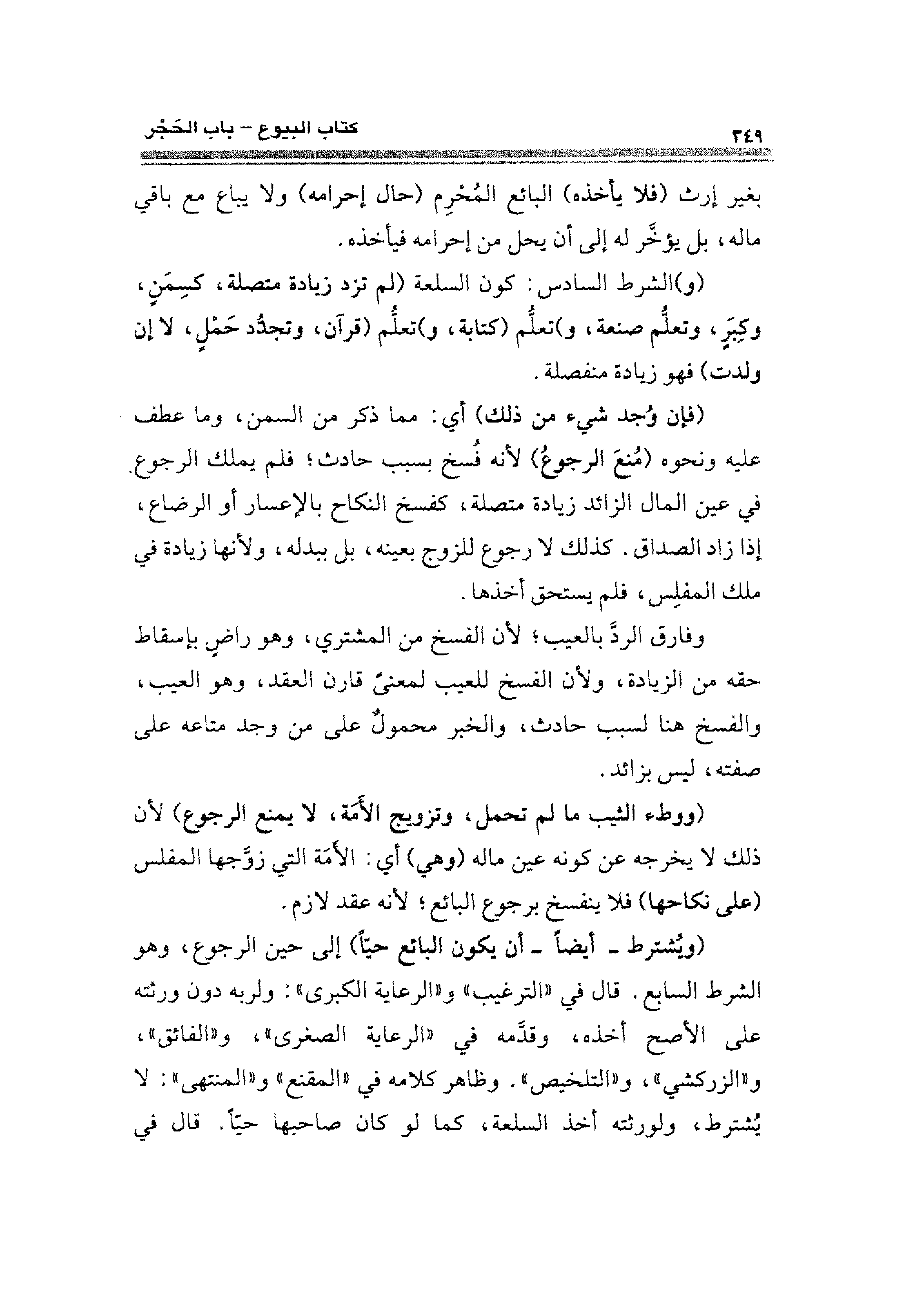 (ويُشترط -أيضًا- أن يكون البائع حيًّا) إلى حين الرجوع، وهو الشرط السابع. قال في "الترغيب" و"الرعاية الكبرى": ولربه دون ورثته على الأصح أخذه، وقدَّمه في "الرعاية الصغرى"، و"الفائق"، و"الزركشي"؛ و"التلخيص". وظاهر كلامه في "المقنع" و"المنتهى": لا يُشترط، ولورثته أخذ السلعة، كما لو كان صاحبها حيًّا. قال في