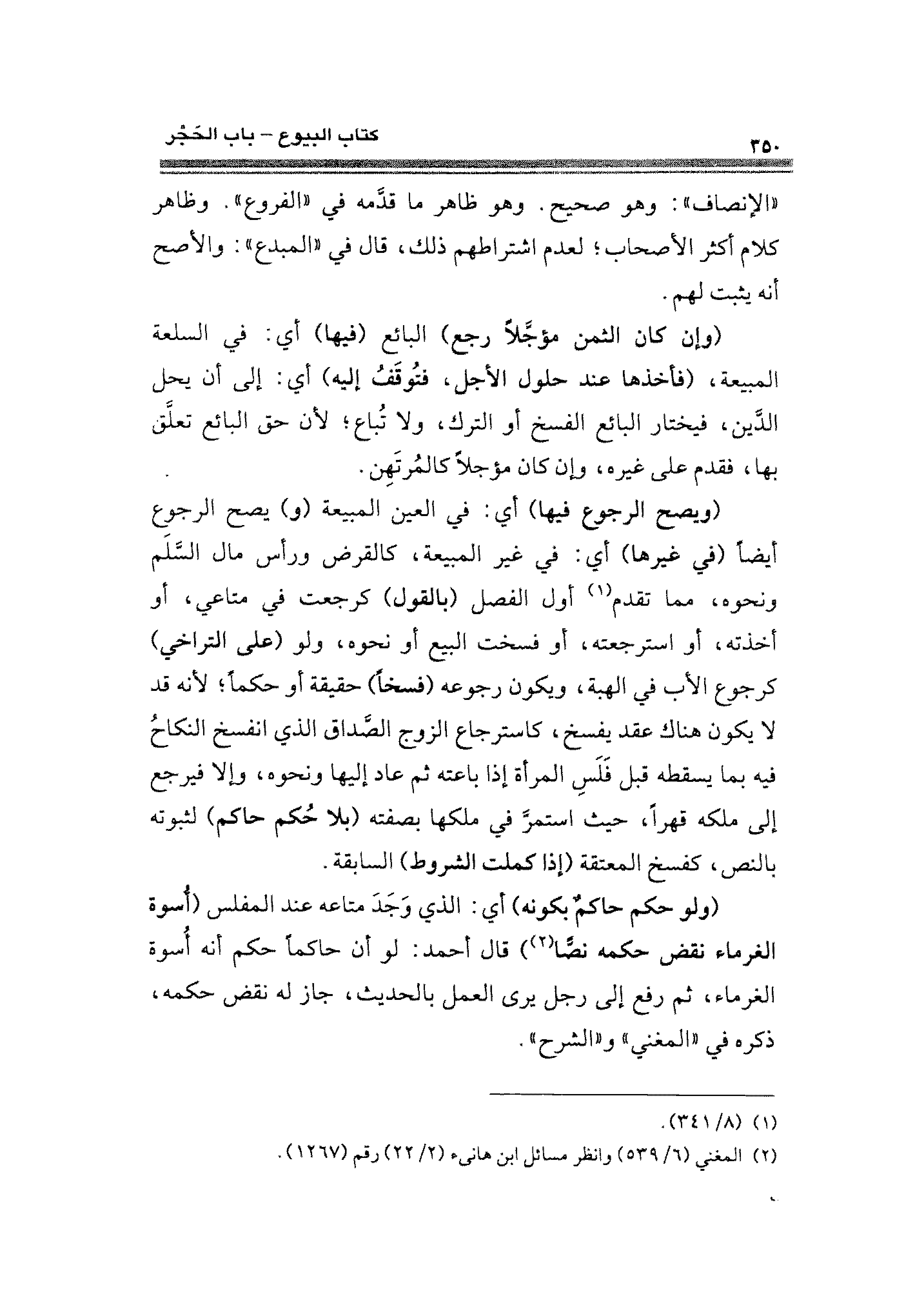 (ويصح الرجوع فيها) أي: في العين المبيعة (و) يصح الرجوع أيضًا (في غيرها) أي: في غير المبيعة، كالقرض ورأس مال السَّلَم ونحوه، مما تقدم (¬١) أول الفصل (بالقول) كرجعت في متاعي، أو أخذته، أو استرجعته، أو فسخت البيع أو نحوه، ولو (على التراخي) كرجوع الأب في الهبة، ويكون رجوعه (فسخًا) حقيقة أو حكمًا؛ لأنه قد لا يكون هناك عقد يفسخ، كاسترجاع الزوج الصَّداق الذي انفسخ النكاحُ فيه بما يسقطه قبل فَلَسِ المرأة إذا باعته ثم عاد إليها ونحوه، وإلا فيرجع إلى ملكه قهرًا، حيث استمرَّ في ملكها بصفته (بلا حُكم حاكم) لثبوته بالنص، كفسخ المعتقة (إذا كملت الشروط) السابقة.