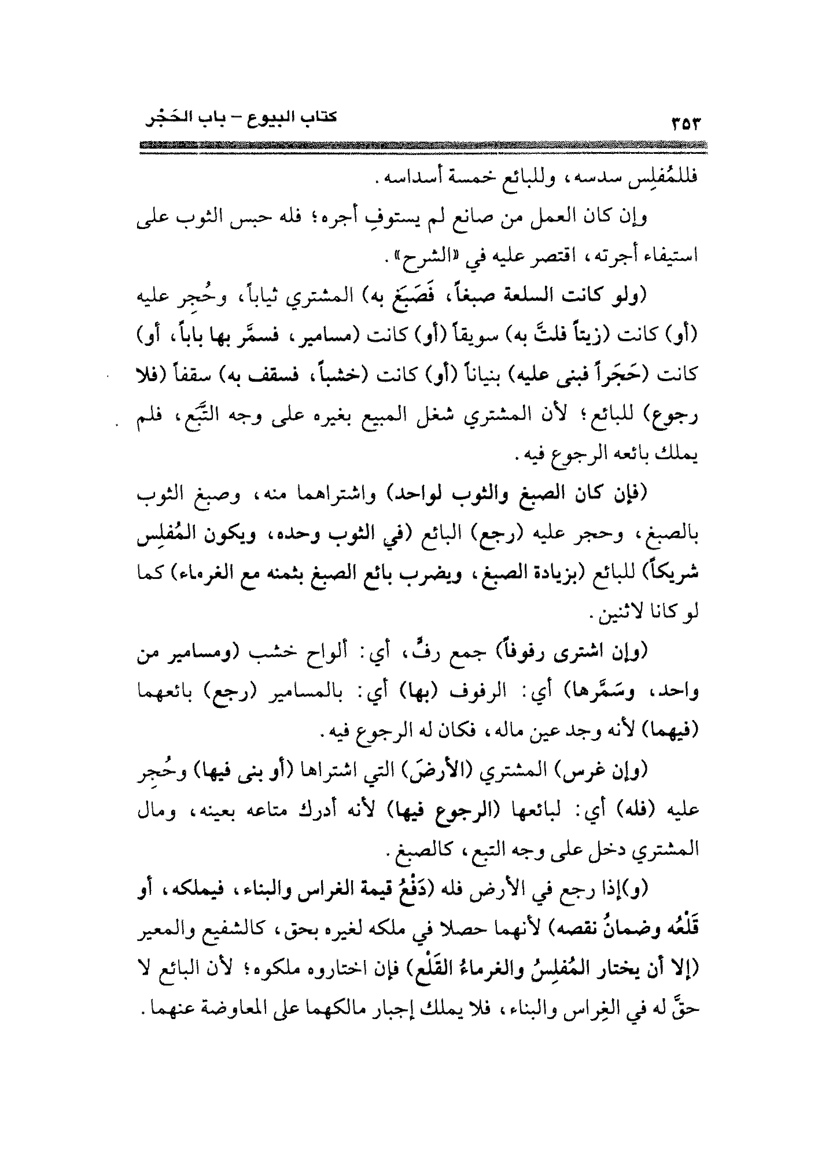 (ولو كانت السلعة صبغًا، فَصَبغَ به) المشتري ثيابًا، وحُجِر عليه (أو) كانت (زيتًا فلتَّ به) سويقًا (أو) كانت (مسامير، فسمَّر بها بابا، أو) كانت (حَجَرًا فبنى عليه) بنيانًا (أو) كانت (خشبًا، فسقف به) سقفًا (فلا رجوع) للبائع؛ لأن المشتري شغل المبيع بغيره على وجه التَّبَع، فلم يملك بائعه الرجوع فيه.