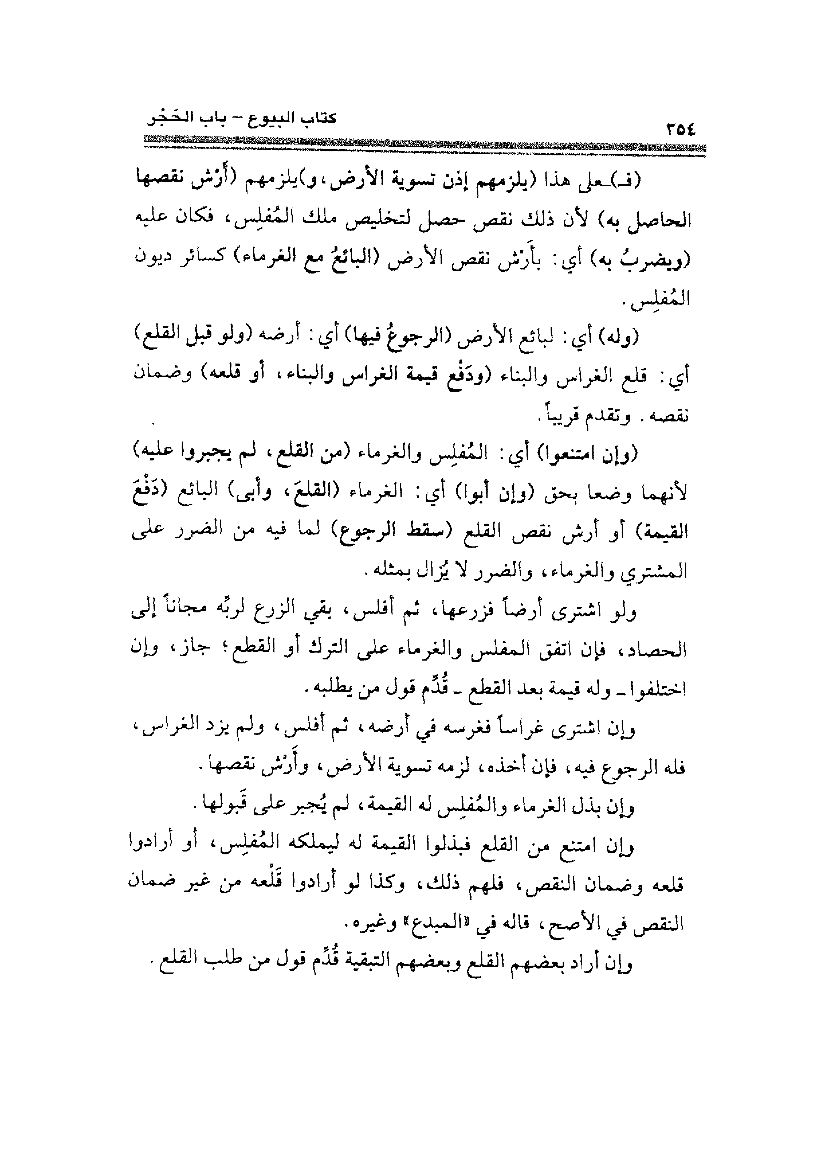 (فـ) ـعلى هذا (يلزمهم إذن تسوية الأرض، و) يلزمهم (أَرْش نقصها الحاصل به) لأن ذلك نقص حصل لتخليص ملك المُفلِس، فكان عليه (ويضربُ به) أي: بأرْش نقص الأرض (البائعُ مع الغرماء) كسائر ديون المُفلِس.
