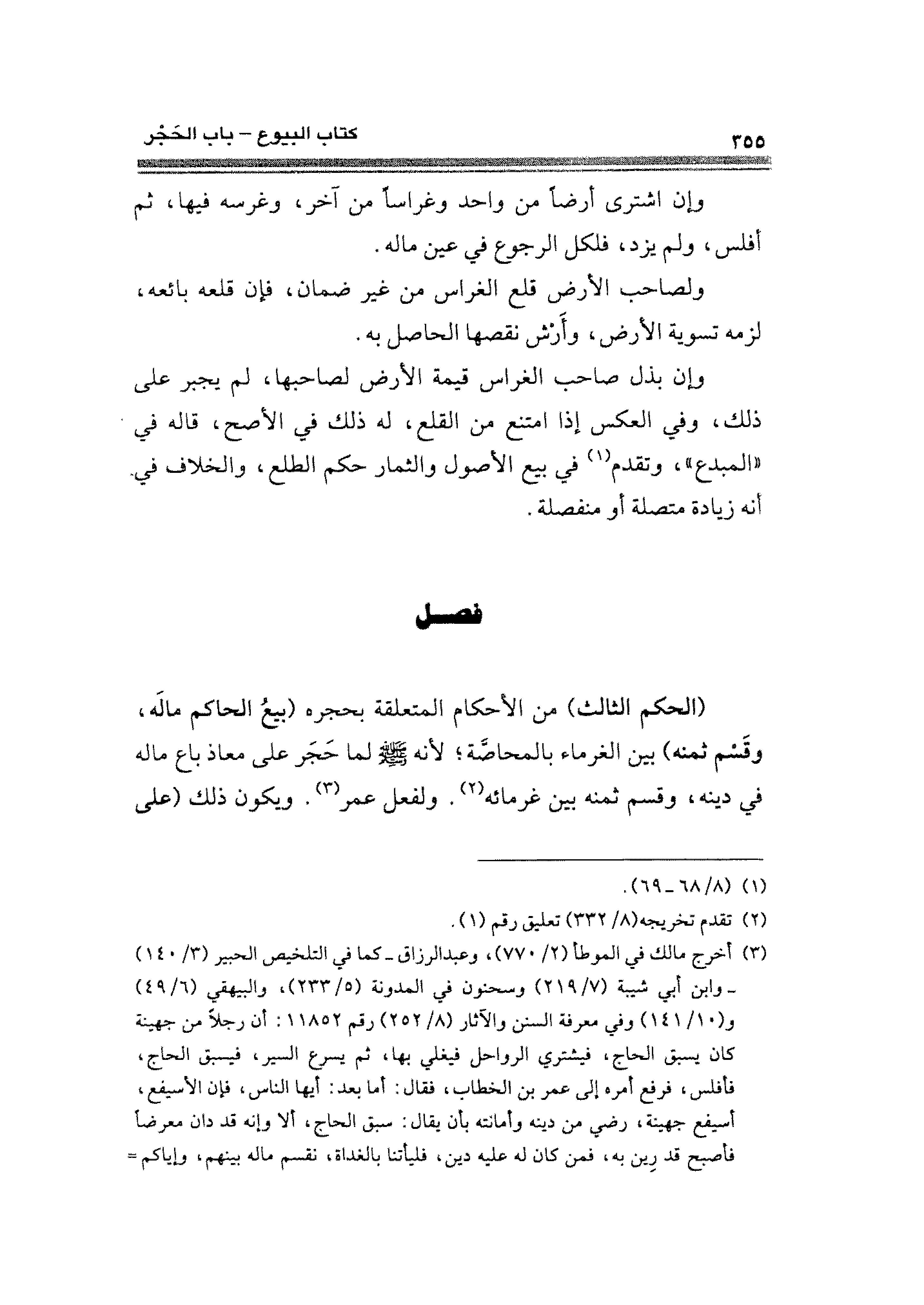 (¬٣) أخرج مالك في الموطأ (٣/ ٧٧٠)، وعبد الرزاق -كما في التلخيص الحبير (٣/ ١٤٠) - وابن أبي شيبة (٧/ ٢١٩) وسحنون في المدونة (٥/ ٢٣٣)، والبيهقي (٦/ ٤٩) و (١٠/ ١٤١) وفي معرفة السنن والآثار (٨/ ٢٥٢) رقم ١١٨٥٢: أن رجلًا عن جهينة كان يسبق الحاج، فيشري الرواحل فيغلي بها، ثم يسرع السير، فيسبق الحاج، فأفلس، فرفع أمره إلى عمر بن الخطاب، فقال: أما بعد: أيها الناس، فإن الأسفع، أسيفع جهينة، رضي من دينه وأمانته بأن يقال: سبق الحاج، ألا وإنه قد دان معرضًا فأصبح قد رِين به، فمن كان له عليه دين، فليأتنا بالغداة، نقسم ماله بينهم، وإياكم =