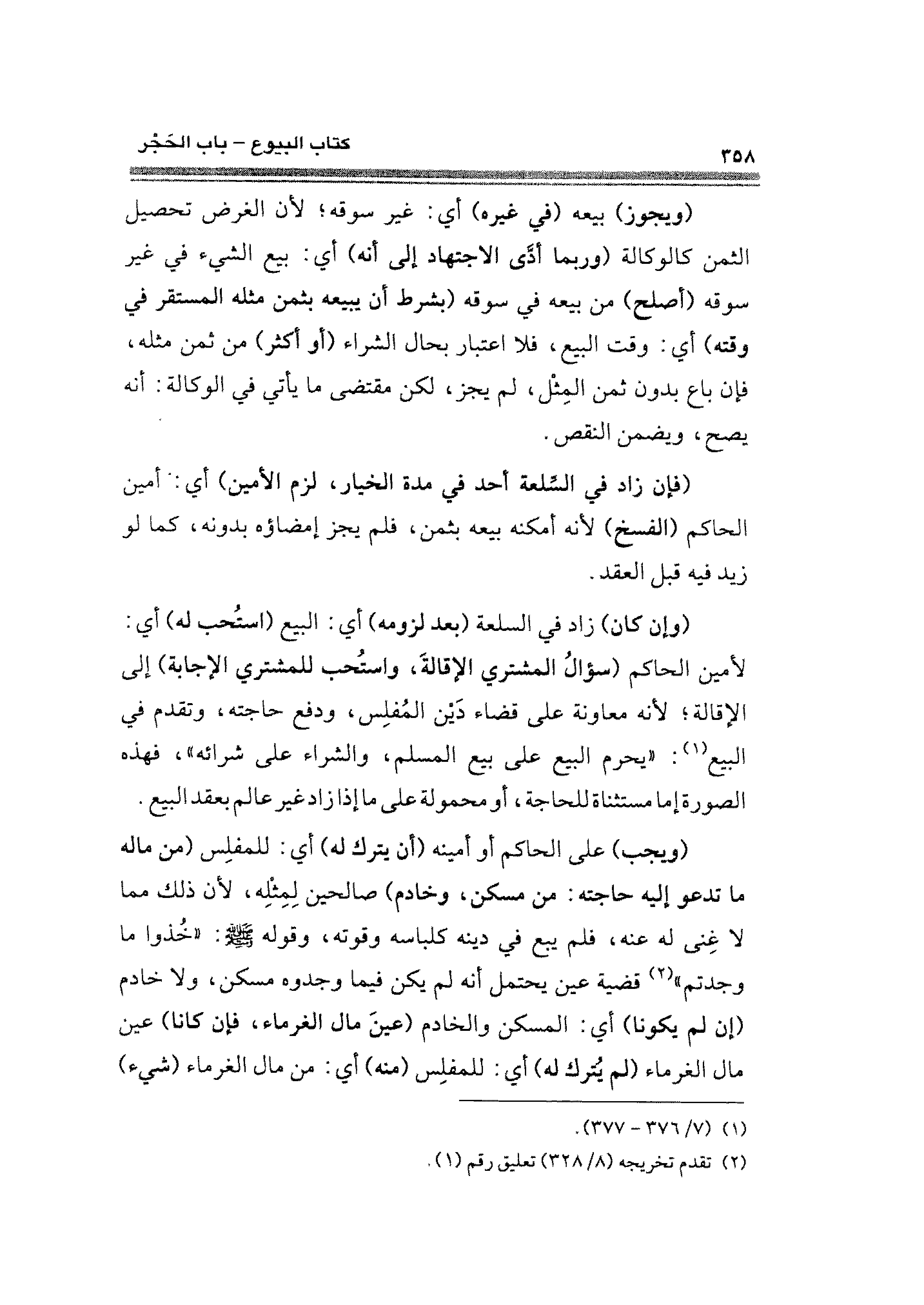 (وإن كان) زاد في السلعة (بعد لزومه) أي: البيع (استُحب له) أي: لأمين الحاكم (سؤالُ المشتري الإقالةَ، واستُحب للمشتري الإجابة) إلى الإقالة؛ لأنه معاونة على قضاء دَيْن المُفلِس، ودفع حاجته، وتقدم في البيع (¬١): "يحرم البيع على بيع المسلم، والشراء على شرائه"، فهذه الصورة إما مستثناة للحاجة، أو محمولة على ما إذا زاد غير عالم بعقد البيع.