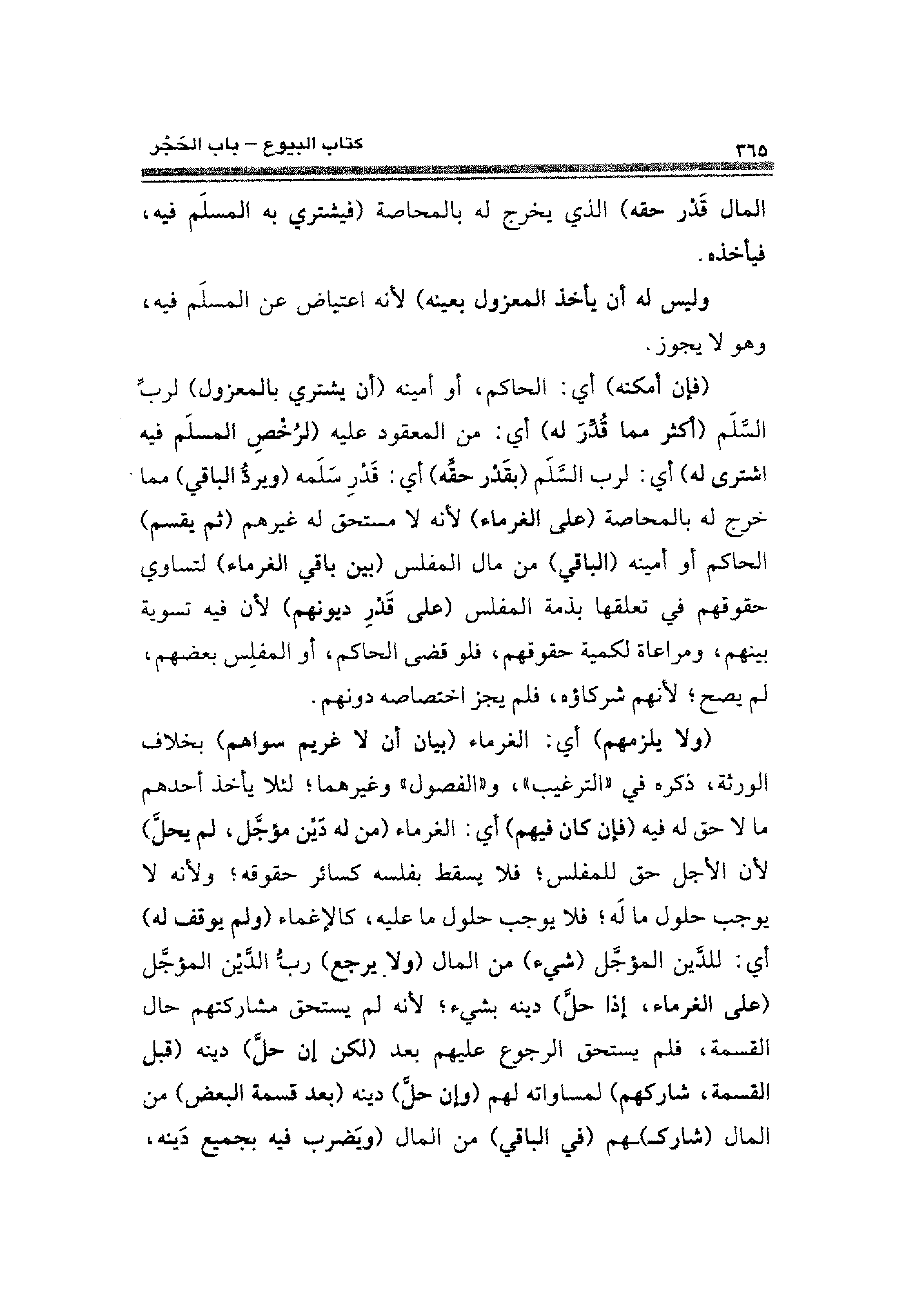 (فإن أمكنه) أي: الحاكم، أو أمينه (أن يشتري بالمعزول) لربِّ السَّلَم (أكثر مما قُدِّرَ له) أي: من المعقود عليه (لرُخْصِ المسلَم فيه اشترى له) أي: لرب السَّلَم (بقَدر حقه) أي: قَدرِ سَلَمه (ويرد الباقي) مما خرج له بالمحاصة (على الغرماء) لأنه لا مستحق له غيرهم (ثم يقسم) الحاكم أو أمينه (الباقي) من مال المفلس (بين باقي الغرماء) لتساوي حقوقهم في تعلقها بذمة المفلس (على قَدرِ ديونهم) لأن فيه تسوية بينهم، ومراعاة لكمية حقوقهم، فلو قضى الحاكم، أو المفلس بعضهم، لم يصح؛ لأنهم شركاؤه، فلم يجز اختصاصه دونهم.