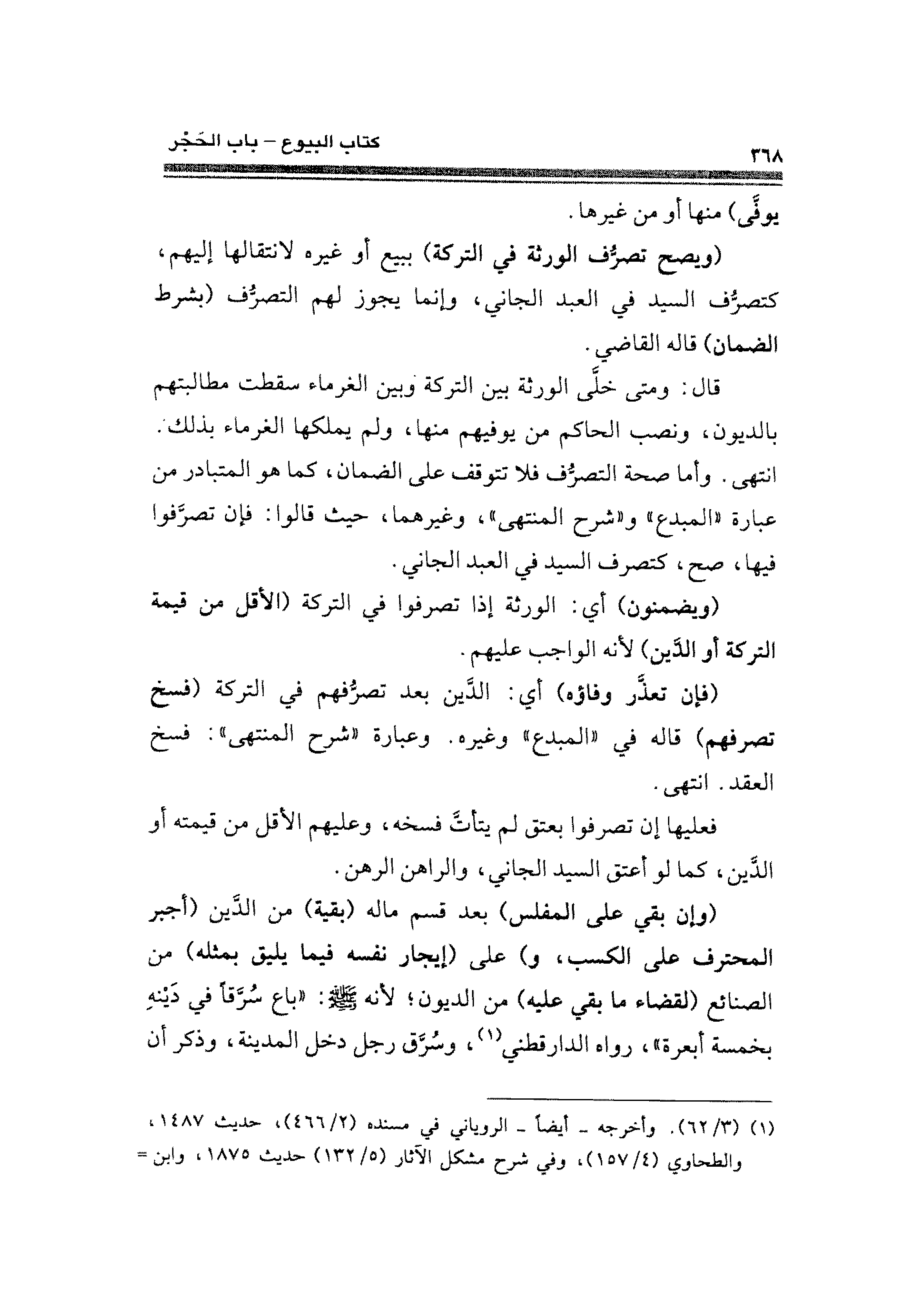 قال: ومتى خلَّى الورثة بين التركة وبين الغرماء سقطت مطالبتهم بالديون، ونصب الحاكم من يوفيهم منها، ولم يملكها الغرماء بذلك. انتهى. وأما صحة التصرُّف فلا تتوقف على الضمان، كما هو المتبادر من عبارة "المبدع" و"شرح المنتهى"، وغيرهما، حيث قالوا: فإن تصرَّفوا فيها، صح، كتصرف السيد في العبد الجاني.