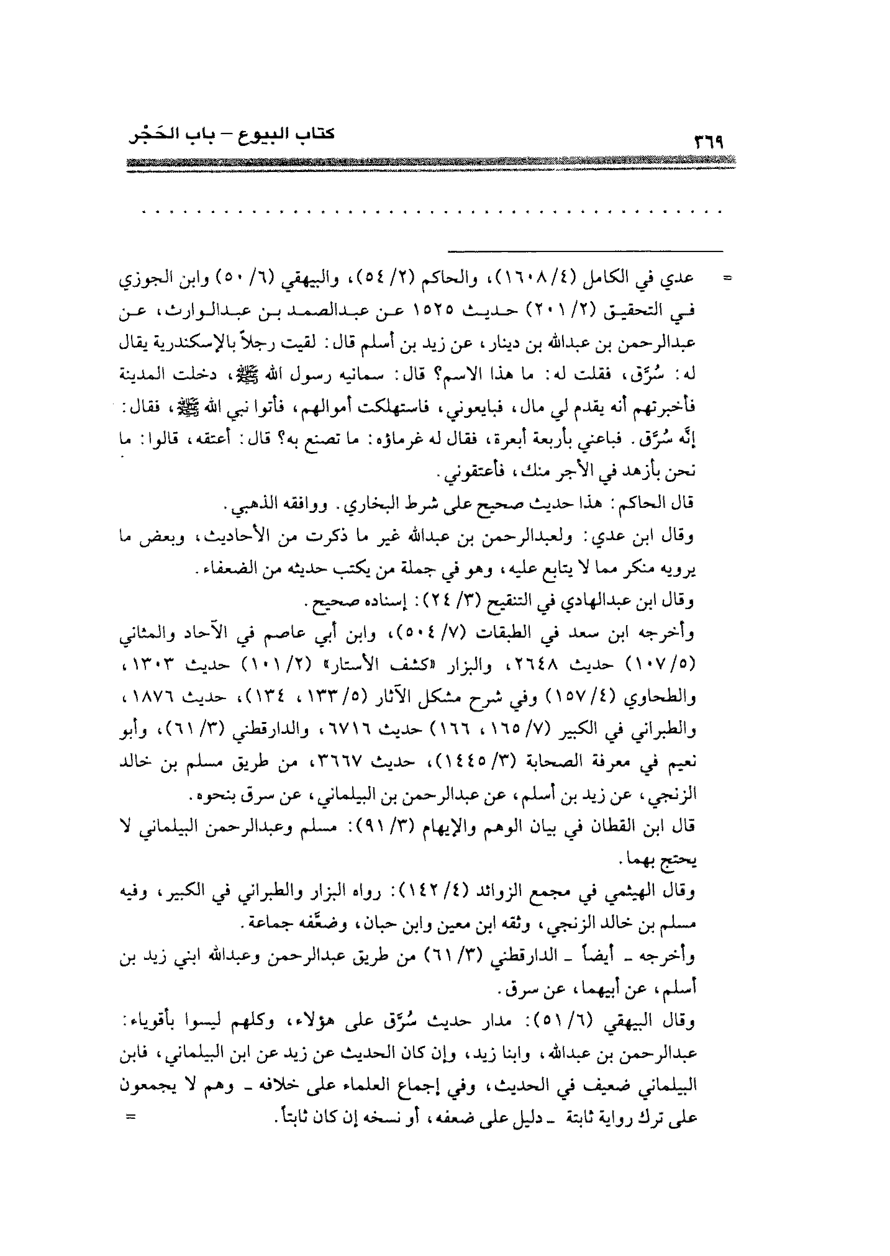 = عدي في الكامل (٤/ ١٦٠٨)، والحاكم (٢/ ٥٤)، والبيهقي (٦/ ٥٠) وابن الجوزي في التحقيق (٢/ ٢٠١) حديث ١٥٢٥ عن عبد الصمد بن عبد الوارث، عن عبد الرحمن بن عبد الله بن دينار، عن زيد بن أسلم قال: لقيت رجلًا بالإسكندرية يقال له: سُرَّق، فقلت له: ما هذا الاسم؟ قال: سمانيه رسول الله - صلى الله عليه وسلم -، دخلت المدينة فأخبرتهم أنه يقدم لي مال، فبايعوني، فاستهلكت أموالهم، فأتوا نبي الله - صلى الله عليه وسلم -، فقال: إنه سُرَّق. فباعني بأربعة أبعرة، فقال له غرماؤه: ما تصنع به؟ قال: أعتقه، قالوا: ما نحن بأزهد في الأجر منك، فأعتقوني.
