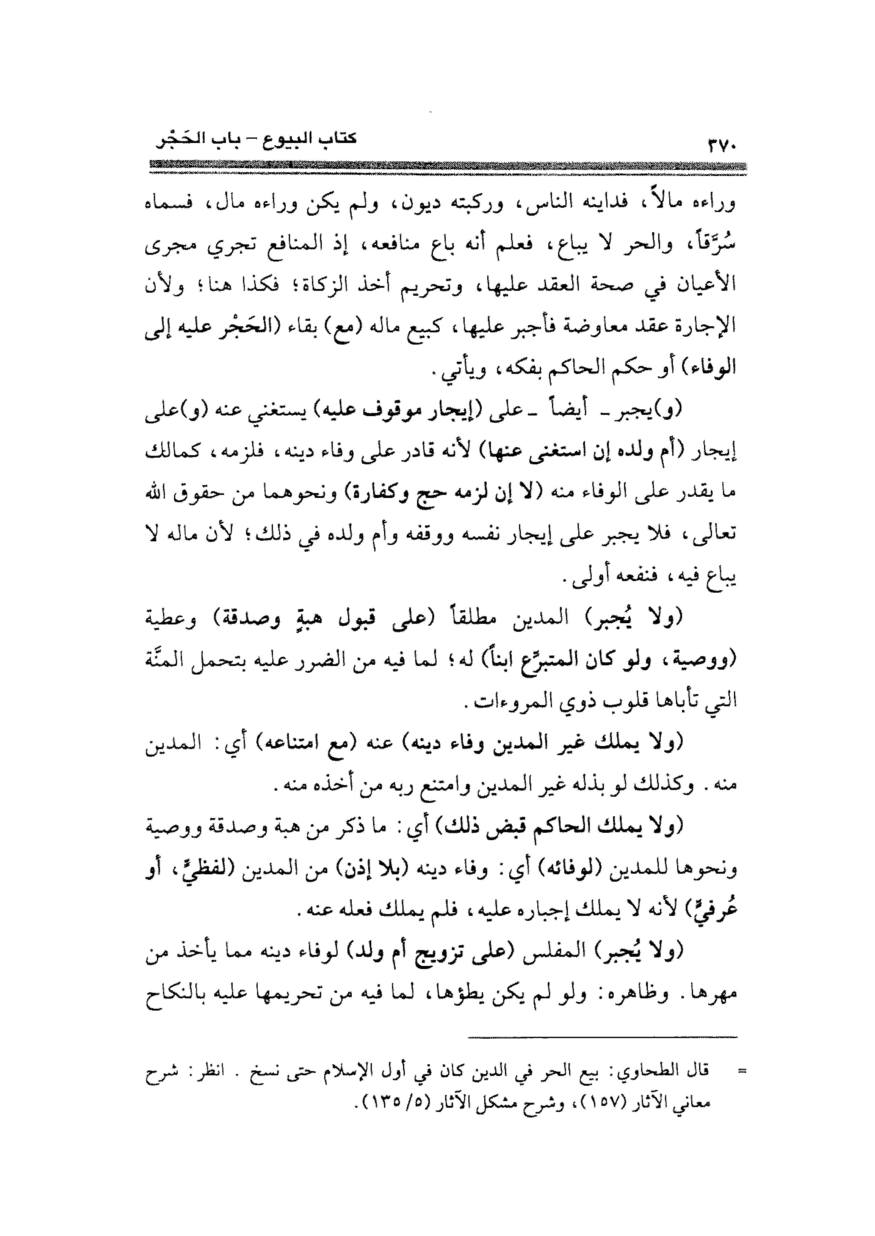 وراءه مالًا، فداينه الناس، وركبته ديون، ولم يكن وراءه مال، فسماه سُرَّقًا، والحر لا يباع، فعلم أنه باع منافعه، إذ المنافع تجري مجرى الأعيان في صحة العقد عليها، وتحريم أخذ الزكاة؛ فكذا هنا؛ ولأن الإجارة عقد معاوضة فأجبر عليها، كبيع ماله (مع) بقاء (الحَجر عليه إلى الوفاء) أو حكم الحاكم بفكه، ويأتي.