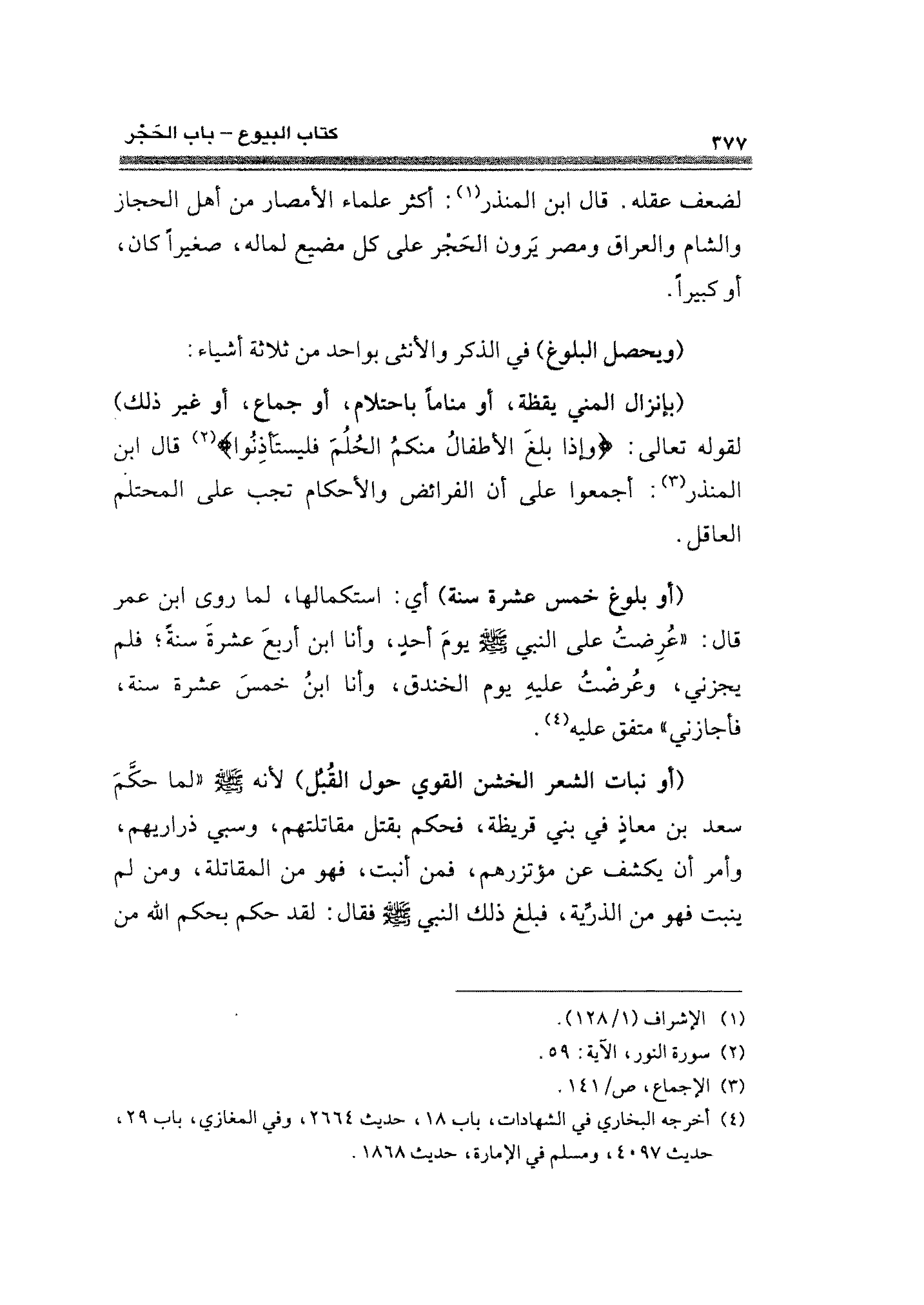 (بإنزال المني يقظة، أو منامًا باحتلام، أو جماع، أو غير ذلك) لقوله تعالى: {وَإِذَا بَلَغَ الْأَطْفَالُ مِنْكُمُ الْحُلُمَ فَلْيَسْتَأْذِنُوا} (¬٢) قال ابن المنذر (¬٣): أجمعوا على أن الفرائض والأحكام تجب على المحتلم العاقل.
