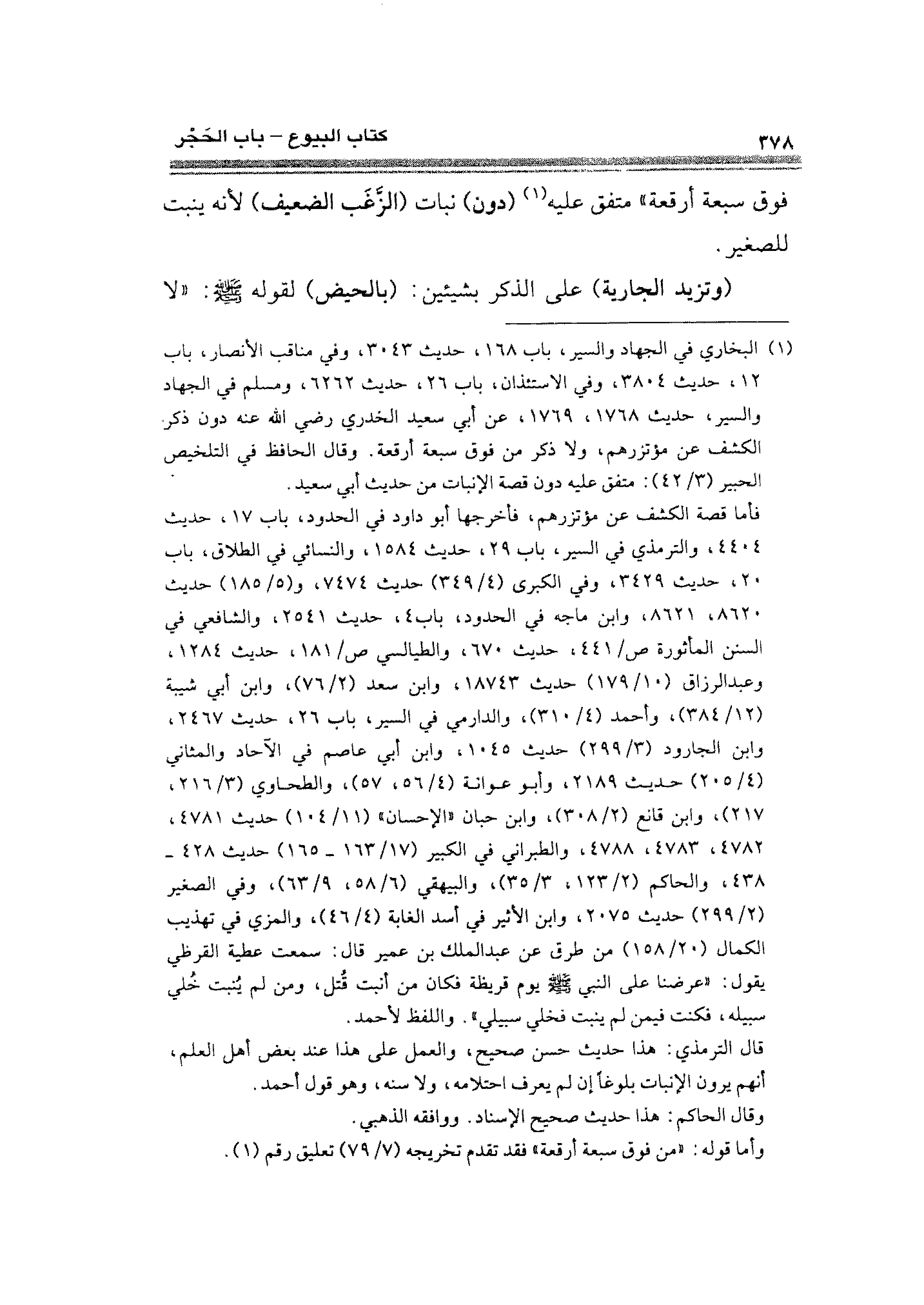 (¬١) البخاري في الجهاد والسير، باب ١٦٨، حديث ٣٠٤٣، وفي مناقب الأنصار، باب ١٢، حديث ٣٨٠٤، وفي الاستئذان، باب ٢٦، حديث ٦٢٦٢، ومسلم في الجهاد والسير، حديث ١٧٦٨، ١٧٦٩، عن أبي سعيد الخدري رضي الله عنه دون ذكر الكشف عن مؤتزرهم، ولا ذكر من فوق سبعة أرقعة. وقال الحافظ في التلخيص الحبير (٣/ ٤٢): متفق عليه دون قصة الإنبات عن حديث أبي سعيد.