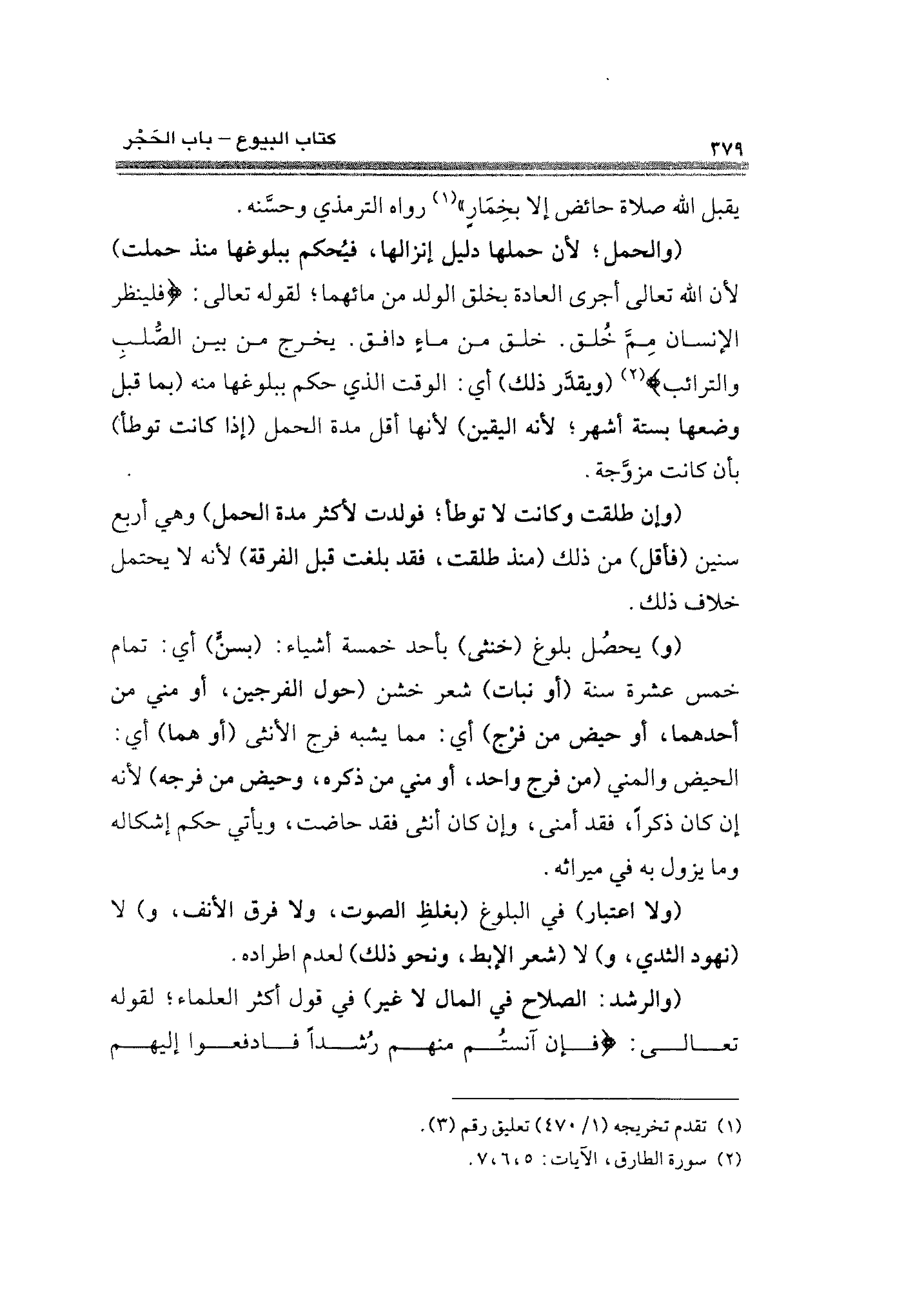 (والحمل؛ لأن حملها دليل إنزالها، فيُحكم ببلوغها منذ حملت) لأن الله تعالى أجرى العادة بخلق الولد من مائهما؛ لقوله تعالى: {فَلْيَنْظُرِ الْإِنْسَانُ مِمَّ خُلِقَ (٥) خُلِقَ مِنْ مَاءٍ دَافِقٍ (٦) يَخْرُجُ مِنْ بَينِ الصُّلْبِ وَالتَّرَائِبِ} (¬٢) (ويقدَّر ذلك) أي: الوقت الذي حكم ببلوغها هذه (بما قبل وضعها بستة أشهر؛ لأنه اليقين) لأنها أقل مدة الحمل (إذا كانت توطأ) بأن كانت مزوجة.