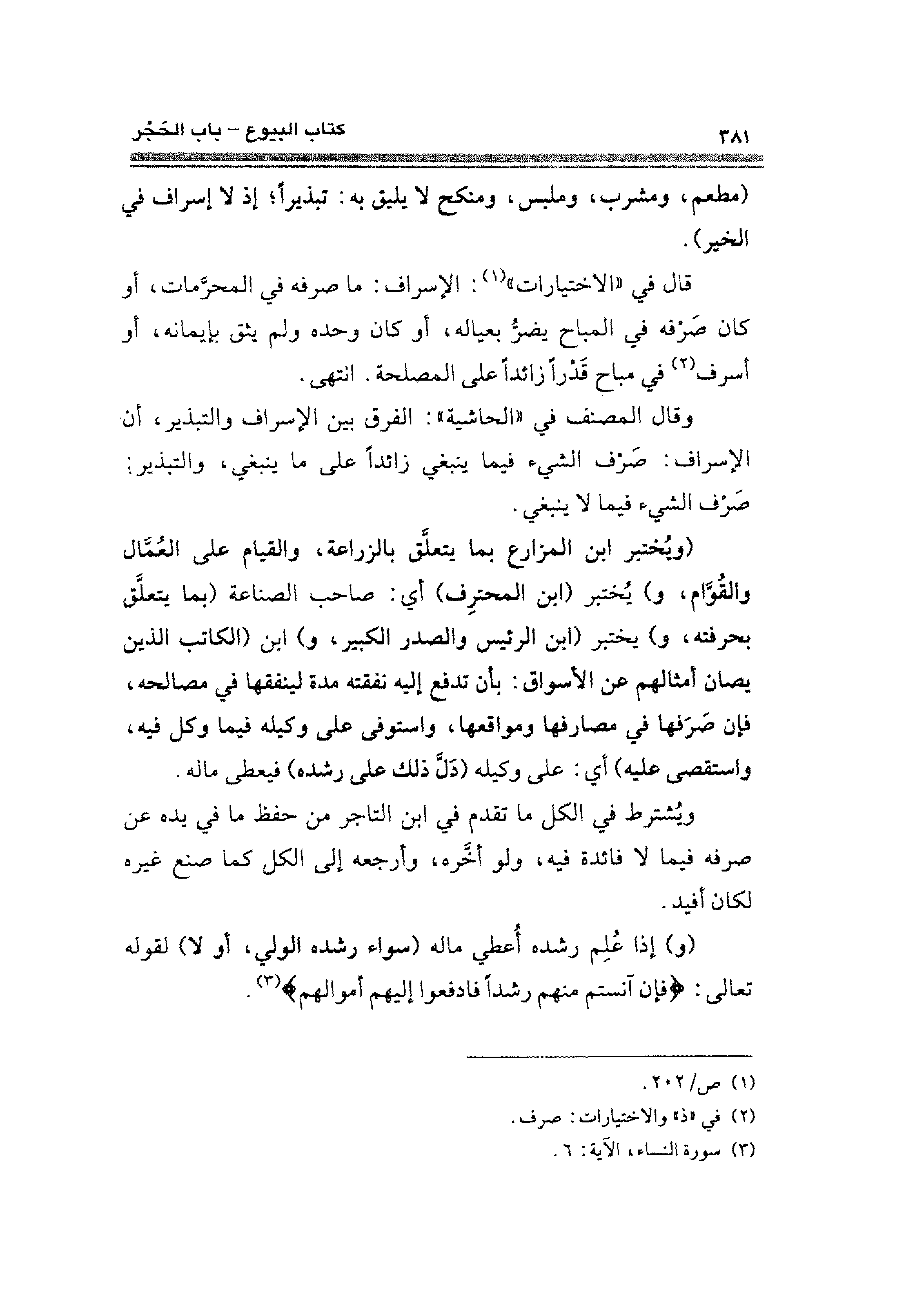 قال في "الاختيارات" (¬١): الإسراف: ما صرفه في المحرَّمات، أو كان صَرْفه في المباح يضرُّ بعياله، أو كان وحده ولم يثق بإيمانه، أو أسرف (¬٢) في مباح قَدْرًا زائدًا على المصلحة. انتهى.