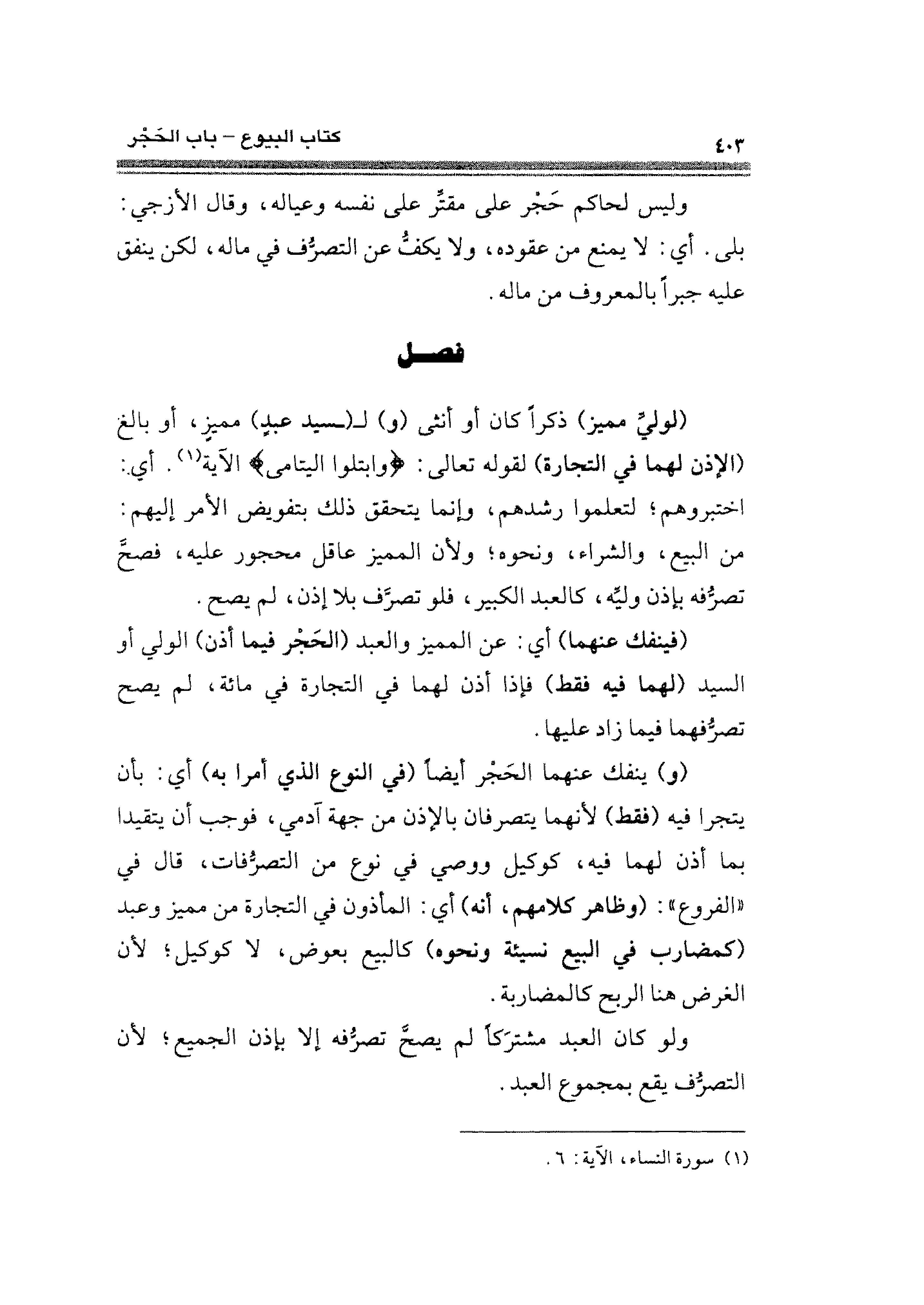 (و) ينفك عنهما الحَجْر أيضًا (في النوع الذي أمرا به) أي: بأن يتجرا فيه (فقط) لأنهما يتصرفان بالإذن من جهة آدمي، فوجب أن يقيدا بما أذن لهما فيه، كوكيل ووصي في نوع من التصرُّفات، قال في "الفروع": (وظاهر كلامهم، أنه) أي: المأذون في التجارة من مميز وعبد (كمضارب في البيع نسيئة ونحوه) كالبيع بعوض، لا كوكيل؛ لأن الغرض هنا الربح كالمضاربة.