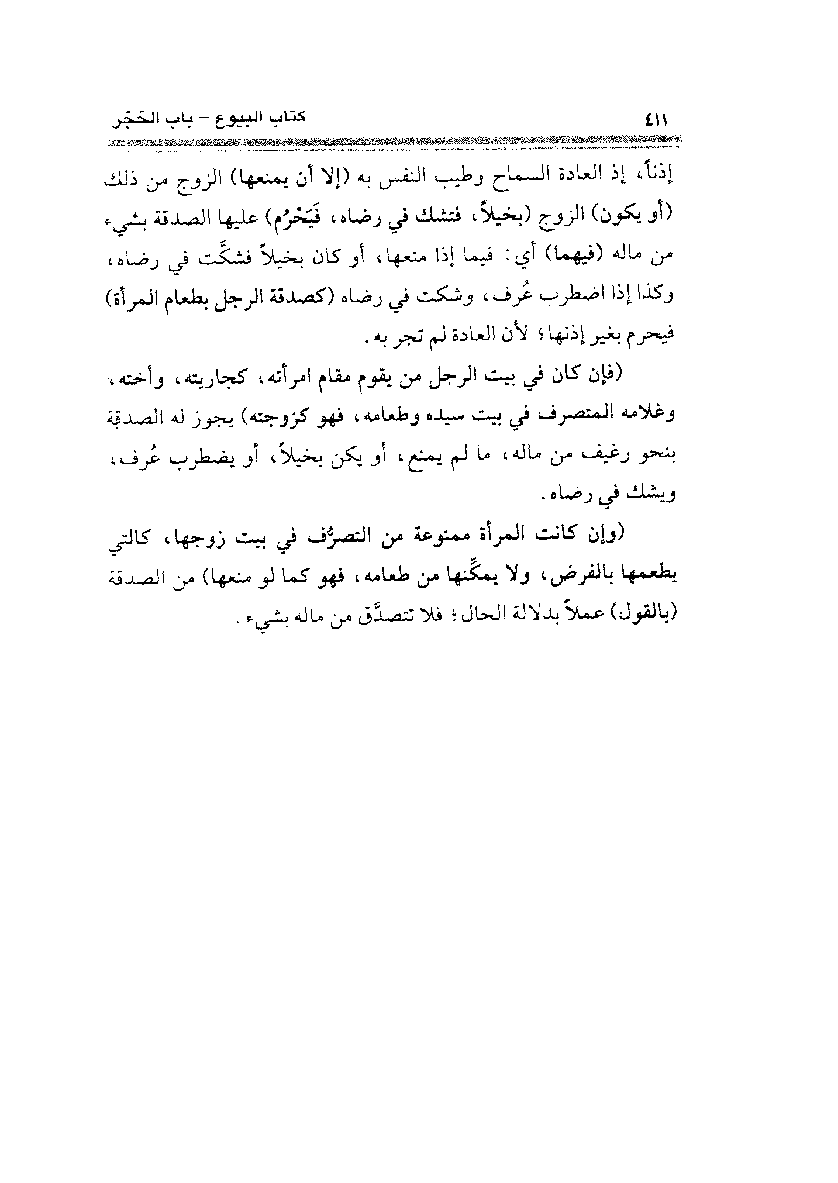إذنًا، إذ العادة السماح وطيب النفس به (إلا أن يمنعها) الزوج من ذلك (أو يكون) الزوج (بخيلًا، فتشك في رضاه، فَيحْرُم) عليها الصدقة بشيء من ماله (فيهما) أي: فيما إذا منعهما، أو كان بخيلًا فشكَّت في رضاه، وكذا إذا اضطرب عُرف، وشكت في رضاه (كصدقة الرجل بطعام المرأة) فيحرم بغير إذنها؛ لأن العادة لم تجر به.
