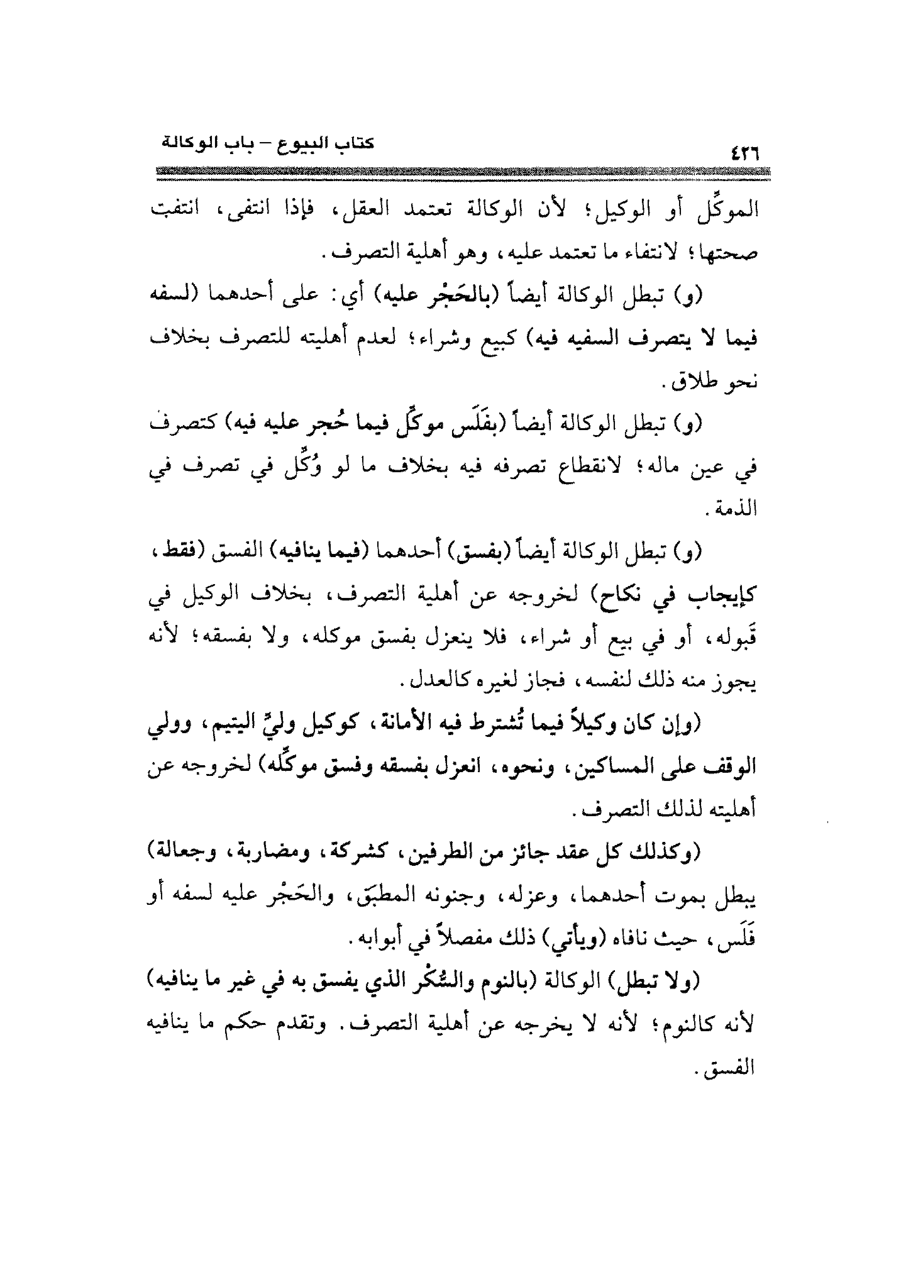 (ولا تبطل) الوكالة (بالنوم والسكر الذي يفسق به في غير ما ينافيه) لأنَّه كالنوم؛ لأنَّه لا يخرجه عن أهلية التصرف. وتقدم حكم ما ينافيه الفسق.