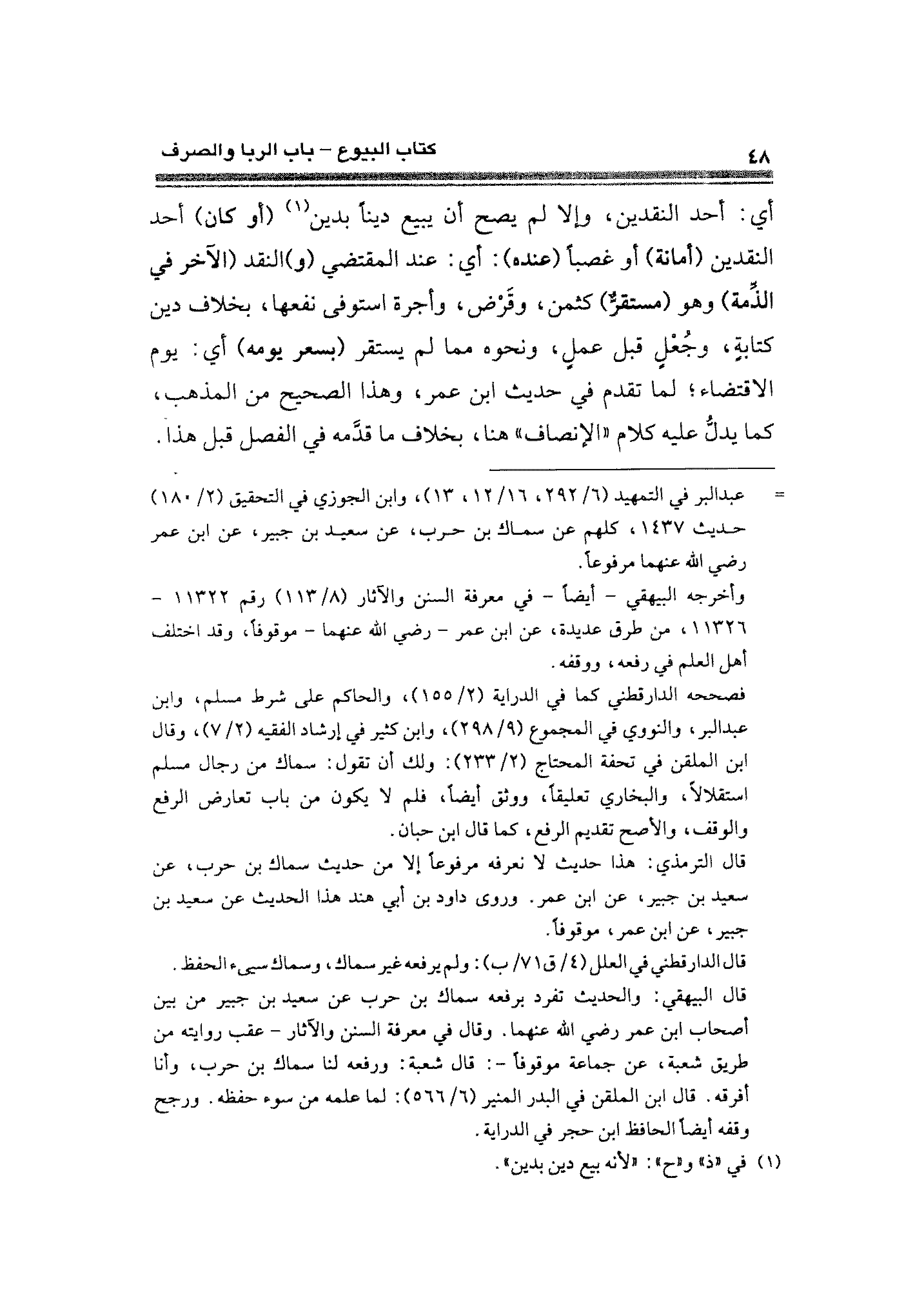 قال البيهقي: والحديث نفرد برفعه سماك بن حرب عن سعيد بن جبير من بين أصحاب ابن عمر - رضي الله عنهما -. وقال في معرفة السنن، الآثار- عقب روايته من طريق شعبة عن جماعة موقوفًا-: قال شعبة: ورفعه لنا سماك بن حرب وأنا أفرقه. قال ابن الملقن في البدر المنير (٦/ ٥٦٦): لما علمه عن حفظه. ورجح وقفه أيضا الحافظ ابن حجر في الدراية.