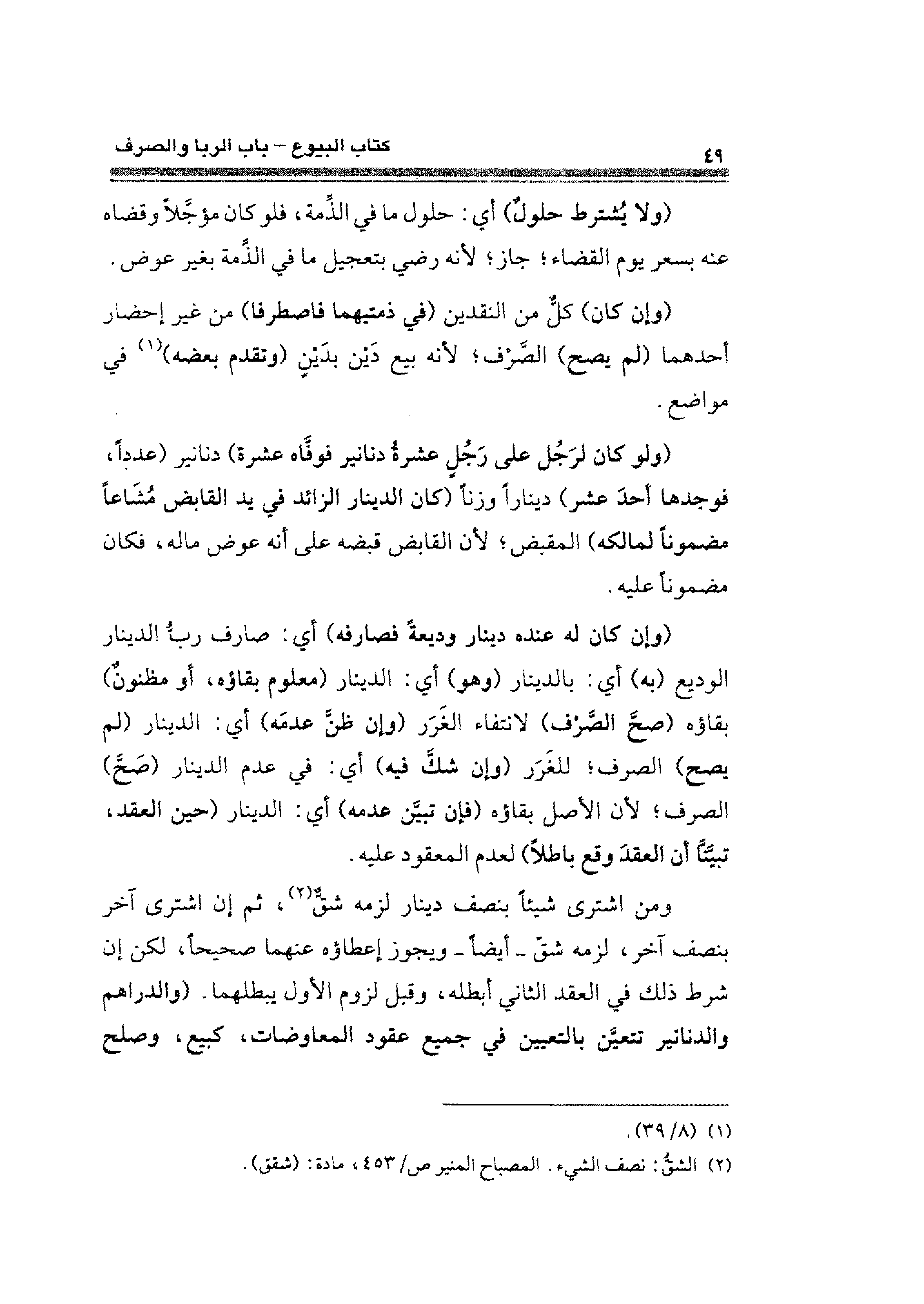 ومن اشترى شيئا بنصف دينار لزمه شقٌّ (¬٢)، ثم ان اشترى آخر بنصف آخر، لزمه شق -أيضًا- ويجوز إعطاؤه عنهما صيحيحًا، لكن إن شرط ذلك في العقد الثاني أبطله، وقيل لزوم الأول يبطلهما. (والدراهم والدنانير تتعين بالتعيين في جميع عقود المعاوضات، كبيع، وصلح