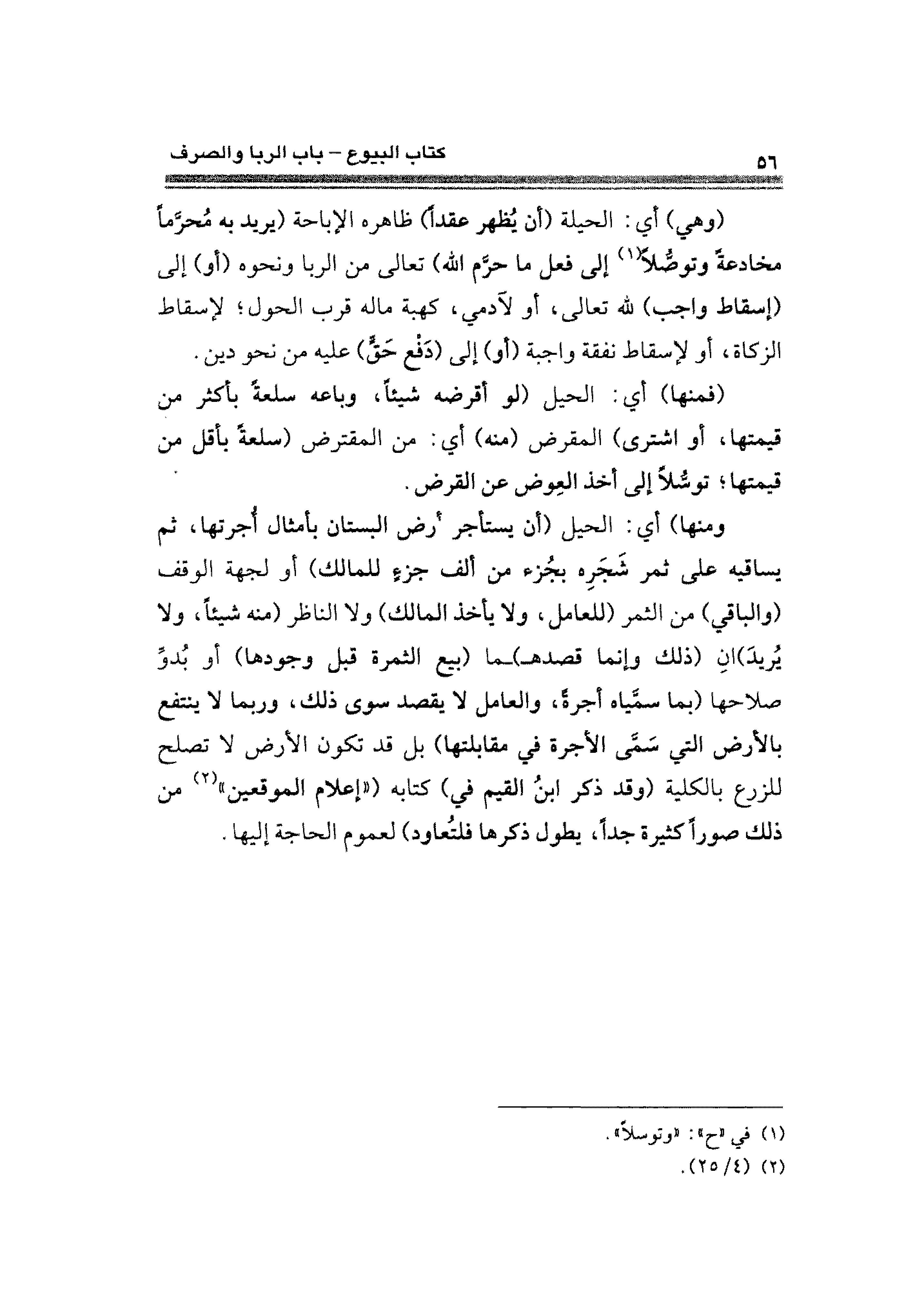 ومنها) أي: الحيل (أن يستأجر أرض البستان بأمثال أُجرتها، ثم يساقيه على ثمر شَجَرِه بجُزء عن ألف جزءٍ للمالك) أو لجهة الوقف (والباقي) من الثمر (للعامل، ولا يأخذ المالك) ولا الناظر (منه شيئًا، ولا يُريدَ) انِ (ذلك وإنما قصدها) - ما (بيع الثمرة قبل وجودها) - أو بُدوٍّ صلاحها (بما سمَّياه أجرةً، والعامل لا يقصد سوى ذلك، وربما لا ينتفع بالأرض التي سَمَّى الأجرة في مقابلتها) بل قد تكون الأرض لا تصلح للزرع بالكلية (وقد ذكر أبنُ القيم في) كتابه ("إعلام الموقعين" (¬٢) عن ذلك صورًا كثيرة جدًّا، طول ذكرها فلتُعاود) لعموم الحاجة إليها.