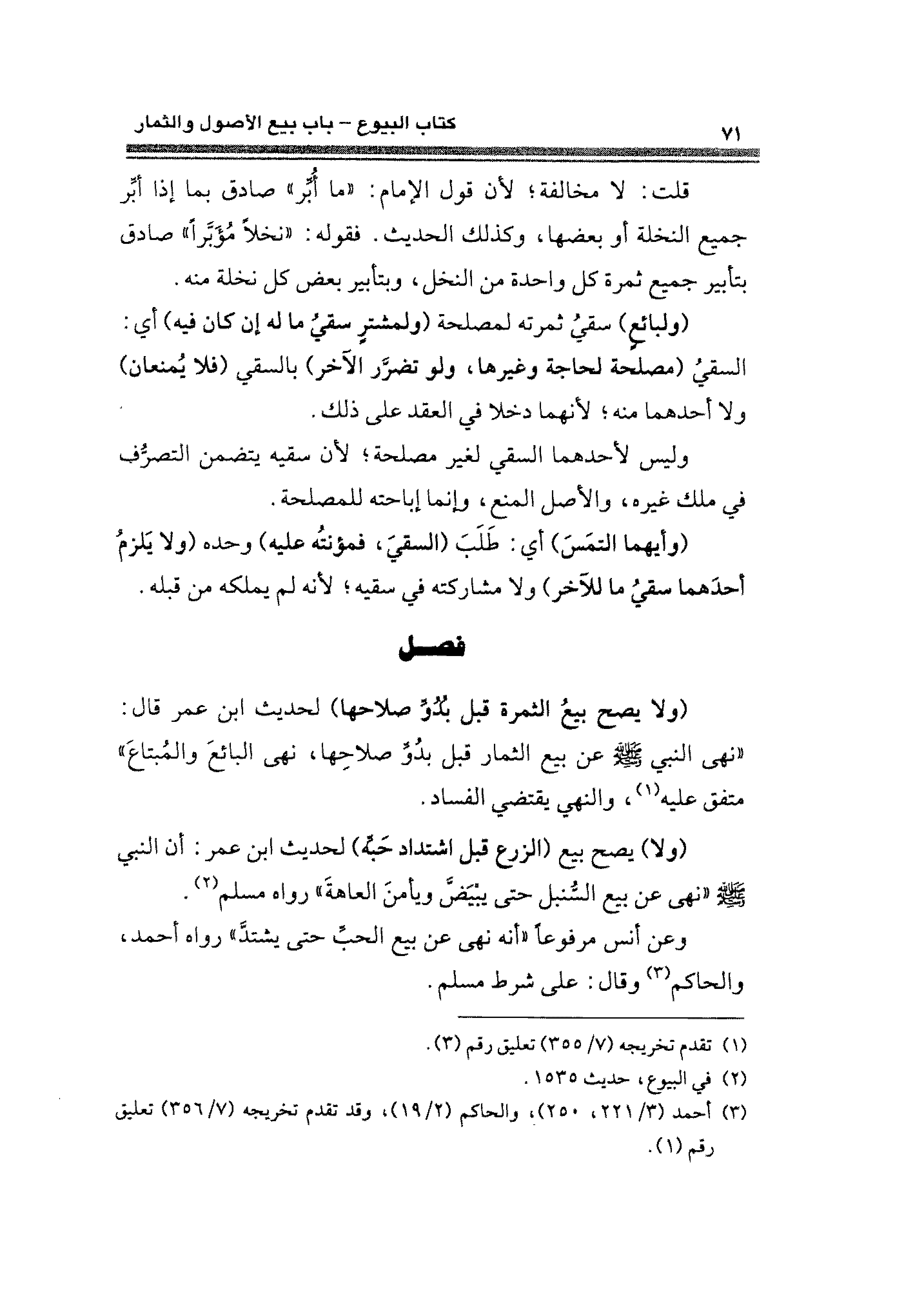 (ولا يصح بيعُ الثمرة قبل بُدُوِّ صلاحها) لحديث ابن عمر قال: "نهى النبي - صلى الله عليه وسلم - عن بيع الثمار قبل بدُوِّ صلاحِها، نهى البائعَ والمُبتاعَ" متفق عليه (¬١)، والنهي يقتضي الفساد.