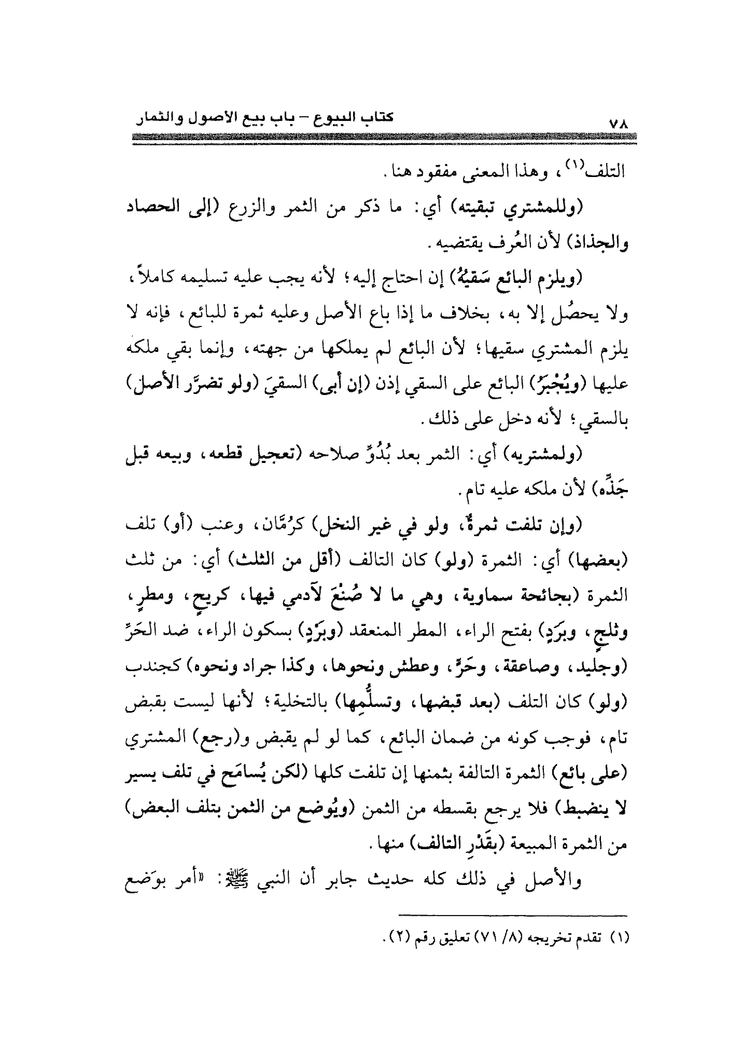 (ويلزم البائع سَقيهُ) إن احتاج إليه؛ لأنه يجب عليه تسليمه كاملًا، ولا يحصُل إلا به، بخلاف ما إذا باع الأصل وعليه ثمرة للبائع، فإنه لا يلزم المشتري سقيها؛ لأن البائع لم يملكها من جهته، وإنما بقي ملكة عليها (ويُجبَرُ) البائع على السقي إذن (إن أبى) السقيَ (ولو تضرَّر الأصل) بالسقي؛ لأنه دخل على ذلك.