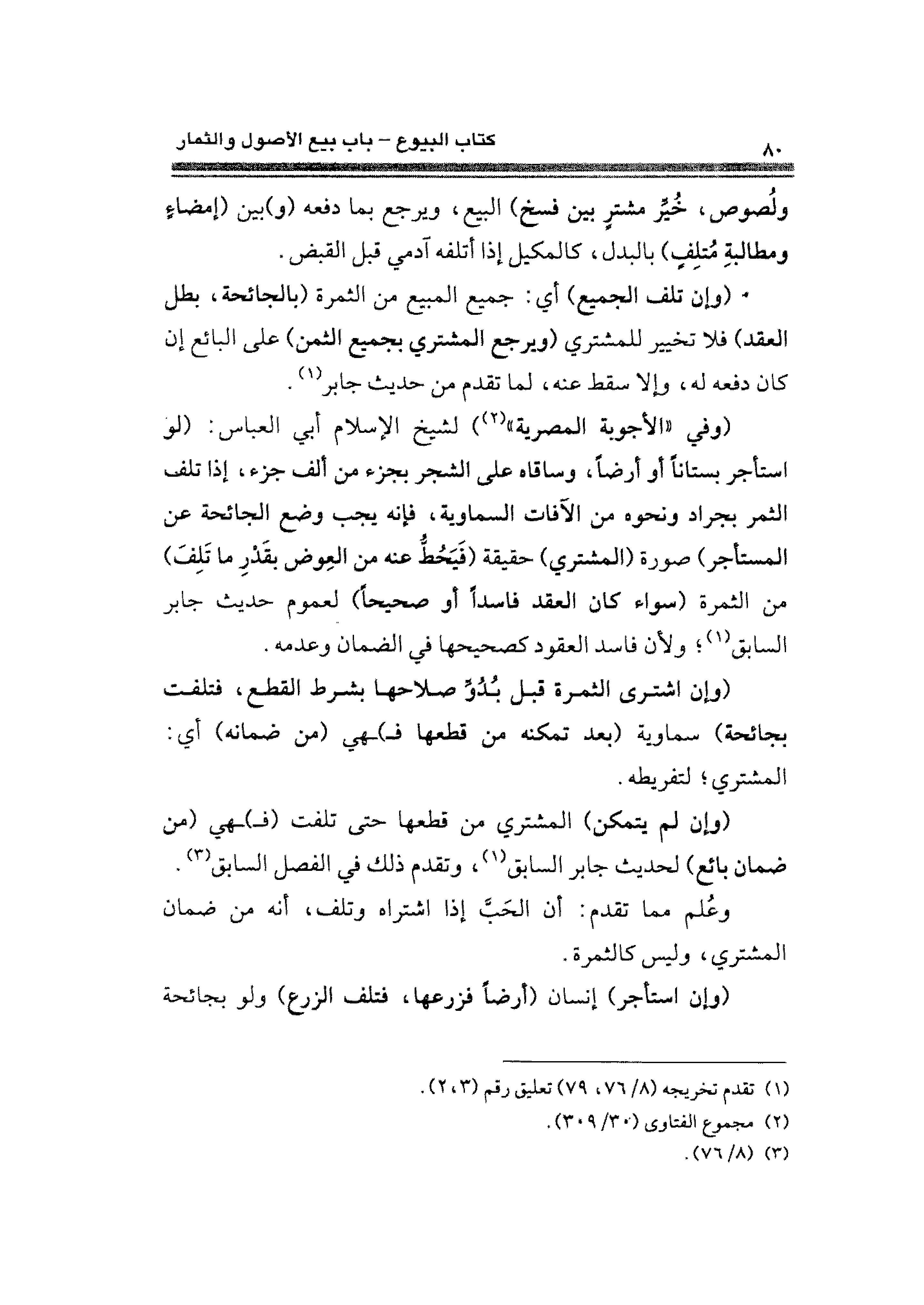 (وفي "الأجوبة المصرية" (¬٢)) لشيخ الإسلام أبي العباس: (لو استأجر بستانًا أو أرضًا، وساقاه على الشجر بجزء من ألف جزء، إذا تلف الثمر بجراد ونحوه من الآفات السماوية، فإنه يجب وضع الجائحة عن المستأجر) صورة (المشتري) حقيقة (فَيَحطُّ عنه من العِوض بقَدْرِ ما تَلِفَ) من الثمرة (سواء كان العقد فاسدا أو صحيحًا) لعموم حديث جابر السابق (١)؛ ولأن فاسد العقود كصحيحها في الضمان وعدمه.