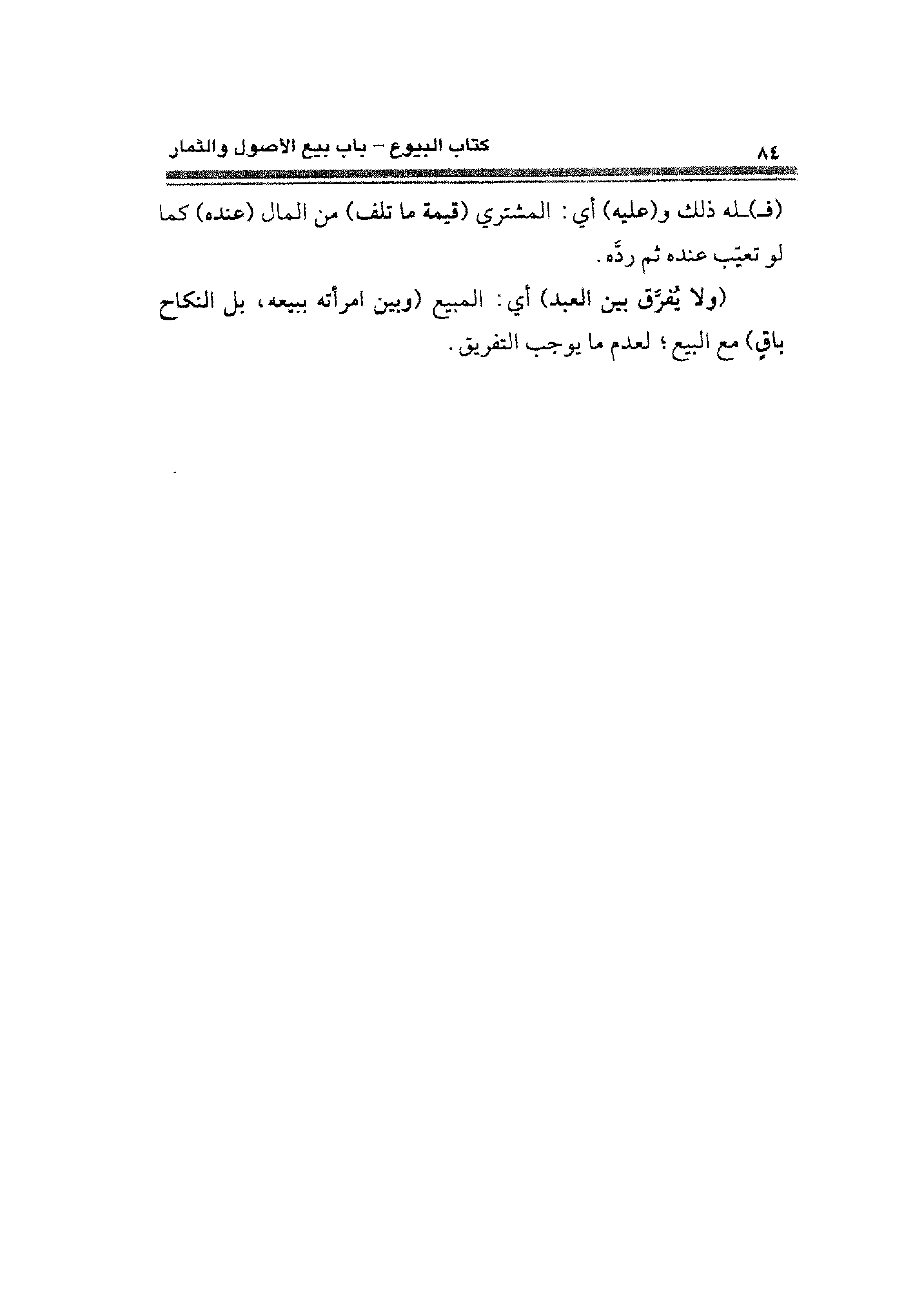 (ولا يُفرَّق بين العبد) أي: المبيع (وبين امرأته ببيعه، بل النكاح باقٍ) مع البيع؛ لعدم ما يوجب التفريق.