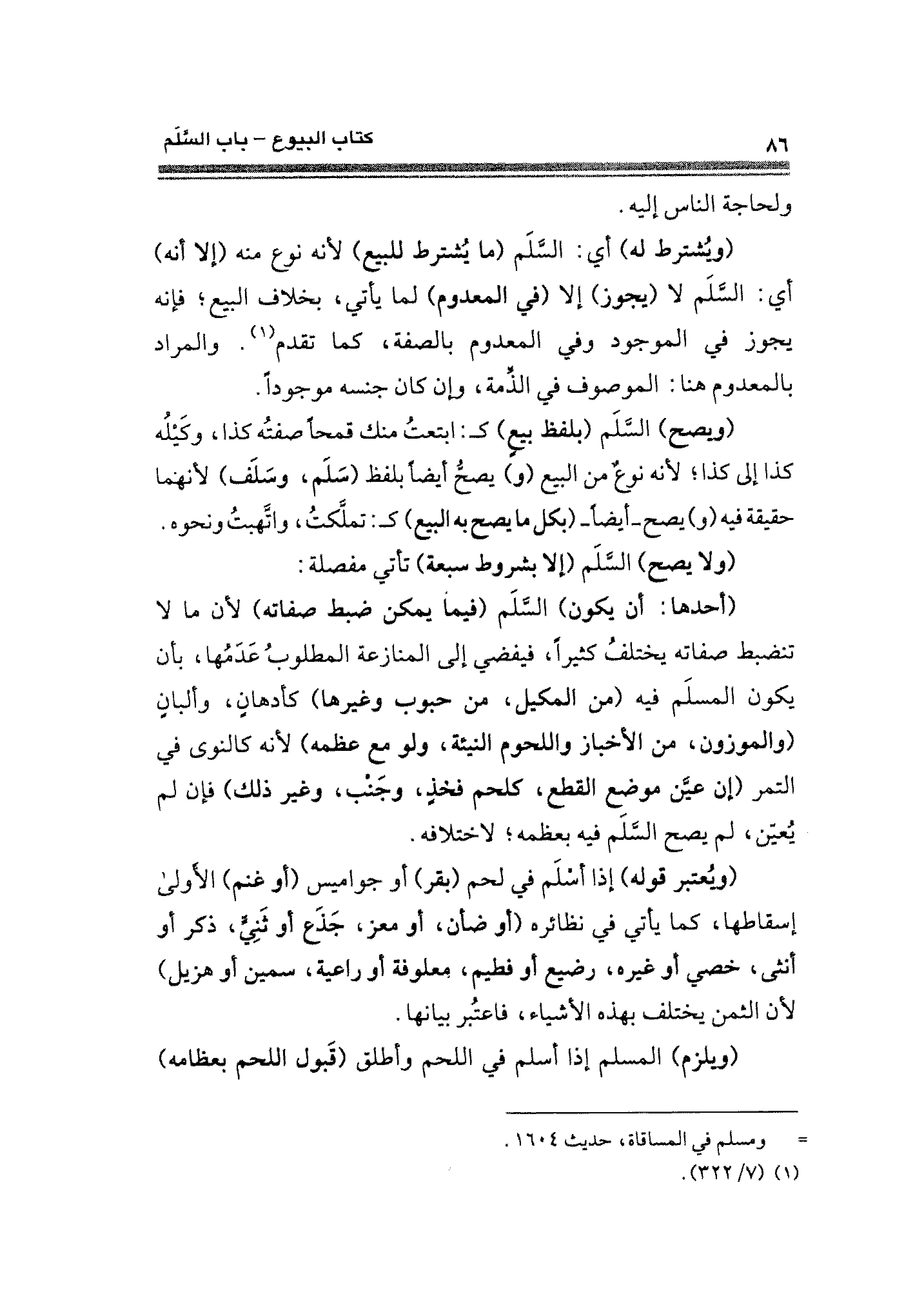 (ولا يصح) السَّلَم (إلا بشروط سبعة) تأتي مفصلة: (أحدها: أن يكون) السَّلمَ (فيما يمكن ضبط صفاته) لأن ما لا تنضبط صفاته يختلفُ كثيرًا، فيفضي إلى المنازعة المطلوبُ عَدَمُها، بأن يكون المسلَم فيه (من المكيل، من حبوب وخميرها) كأدهانٍ، وألبانٍ (والموزون، من الأخباز واللحوم النيئة، ولو مع عظمه) لأنه كالنوى في التمر (إن عيَّن موضع القطع، كلحم فخذٍ، وجَنْب، وغير ذلك) فإن لم يُعيّن، لم يصع السَّلَم فيه بعظمه؛ لاختلافه.