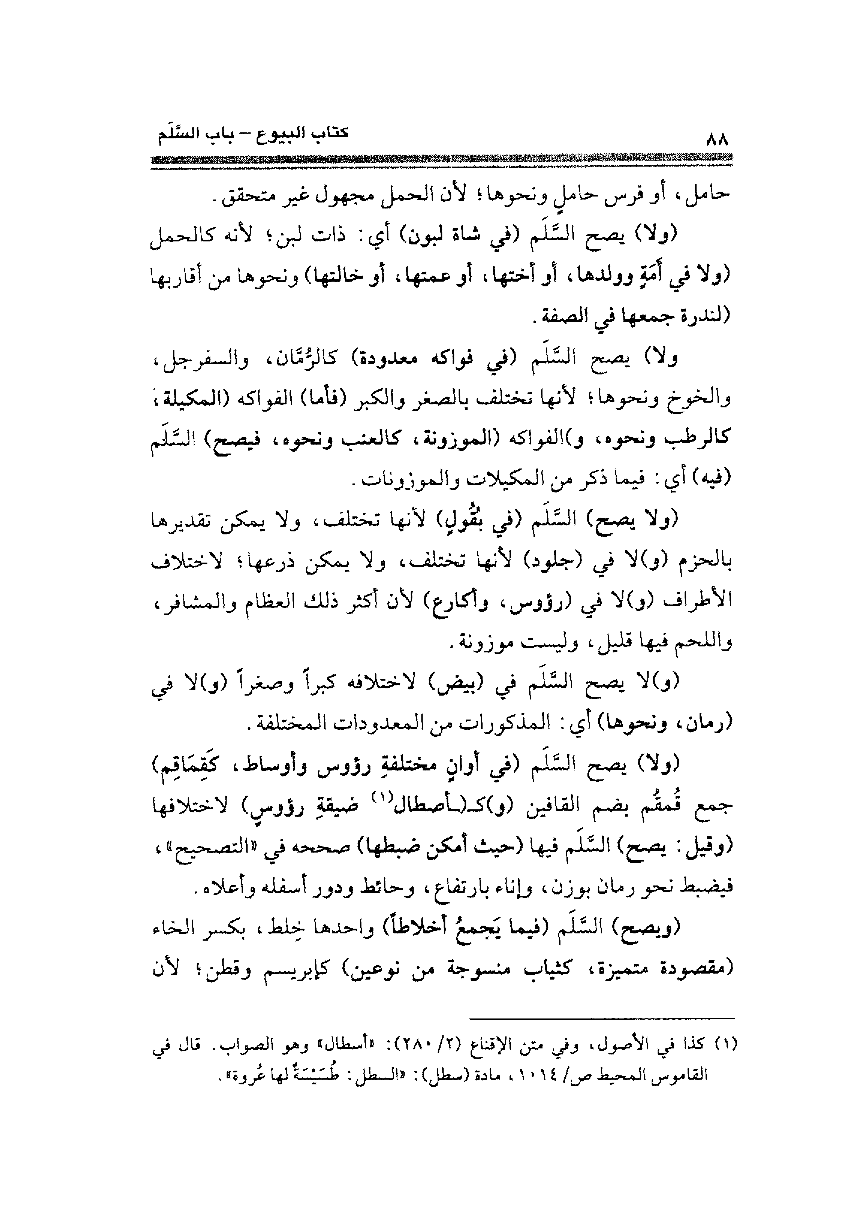 (ولا) يصح السَّلَم (في أوانٍ مختلفةِ رؤوس وأوساط، كَقِمَاقم) جمع قُمقُم بضم القافين (و) كـ (ـأصطال (¬١) ضيقةِ رؤوسٍ) لاختلافها (وقيل: يصح) السَّلَم فيها (حيث أمكن ضبطها) صححه في "التصحيح"، فيضبط نحو رمان بوزن، وإناء بارتفاع، وحائط ودور أسفله وأعلاه.