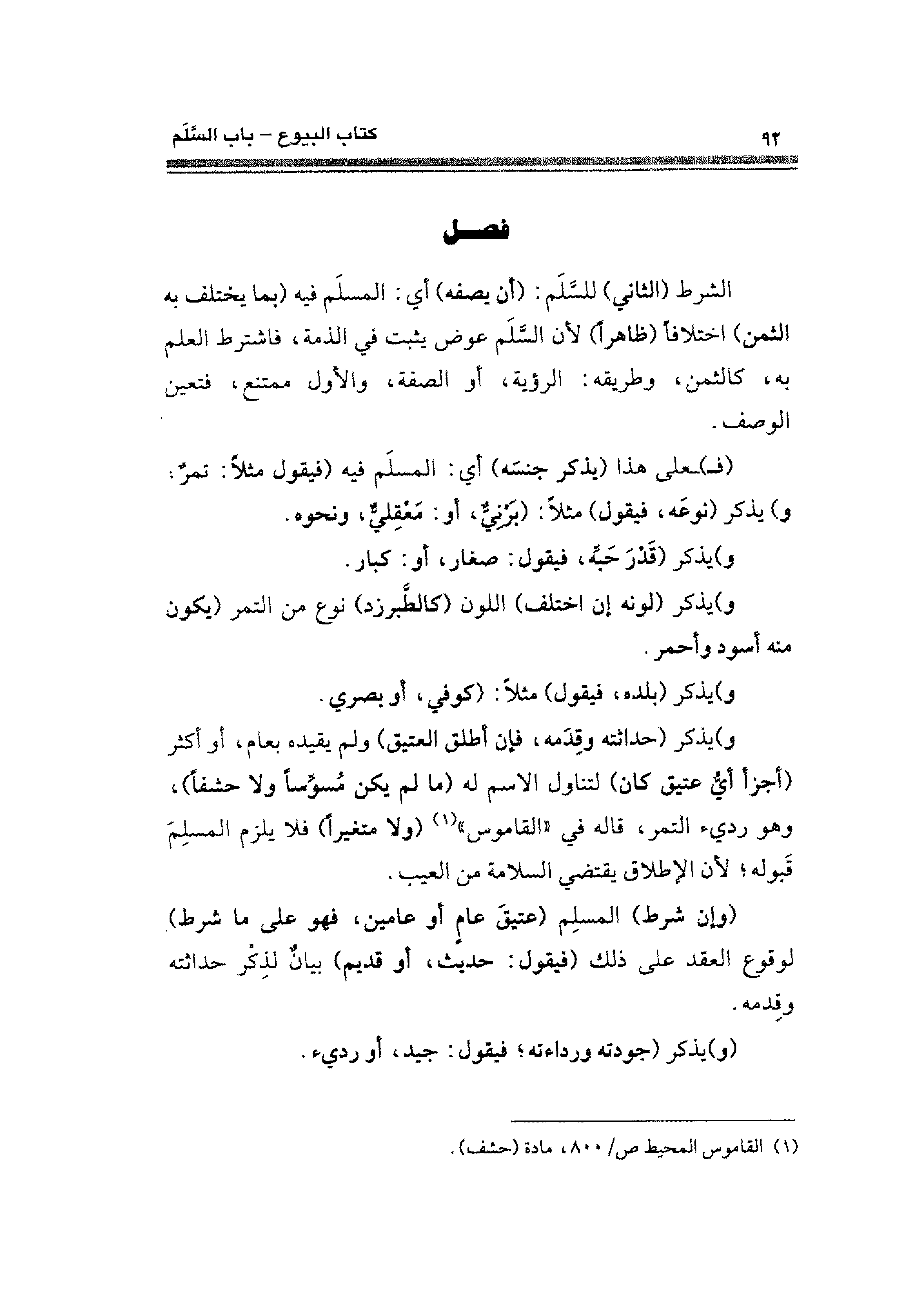 الشرط (الثاني) للسَّلَم: (أن يصفه) أي: المسلَم فيه (بما يختلف به الثمن) اختلافا (ظاهرًا) لأن السَّلَم عوض يثبت في الذمة، فاشترط العلم به، كالثمن، وطريقه: الرؤية، أو الصفة، والأول ممتنع، فتعين الوصف.