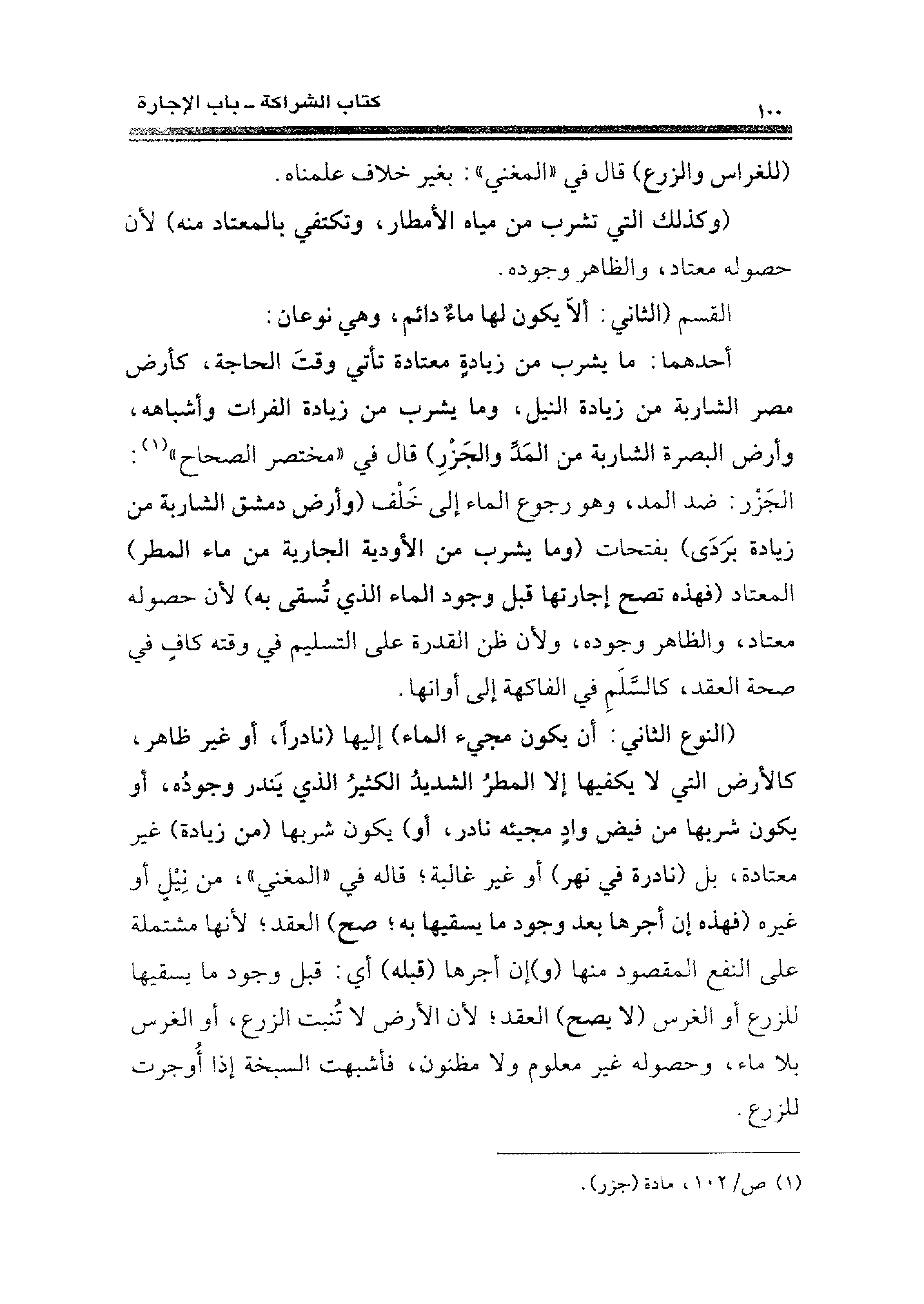 أحدهما: ما يثرب من زيادةٍ معتادة تأتي وقتَ الحاجة، كأرض مصر الشاربة من زيادة النيل، وما يشرب من زيادة الفرات وأشباهه، وأرض البصرة الشاربة من المَدِّ والجَزْرِ) قال في "مختصر الصحاح" (¬١): الجَزر: ضد المد، وهو رجوع الماء إلى خَلْف (وأرض دمشق الشاربة من زيادة بَرَدَى) بفتحات (وما يشرب من الأودية الجارية من ماء المطر) المعتاد (فهذه تصح إجارتها قبل وجود الماء الذي تُسقى به) لأن حصوله معتاد، والظاهر وجوده، ولأن ظن القدرة على التسليم في وقته كافٍ في صحة العقد، كالسَّلَمِ في الفاكهة إلى أوانها.