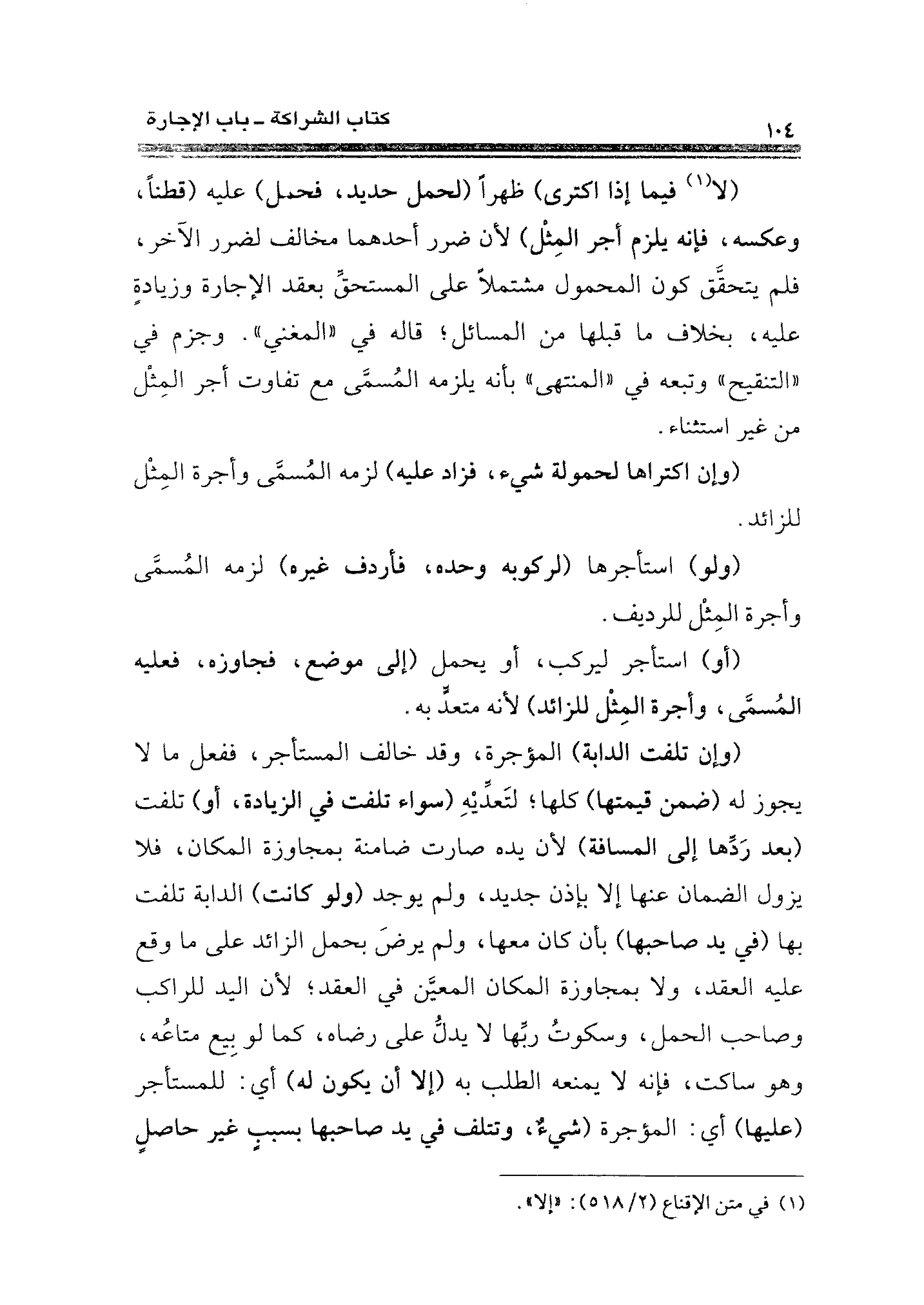 إلا (¬١) فيما إذا اكترى) ظهرًا (لحمل حديد، فحمل) عليه (قطنًا، وعكسه، فإنه يلزم أجر المِثْل) لأن ضرر أحدهما مخالف لضرر الآخر، فلم يتحقَّق كون المحمول مشتملًا على المستحق بعقد الإجارة وزيادة عليه، بخلاف ما قبلها من المسائل؛ قاله في "المغني". وجزم في "التنقيح" وتبعه في "المنتهى" بأنه يلزمه المُسمَّى مع تفاوت أجر المِثْل من غير استثناء.