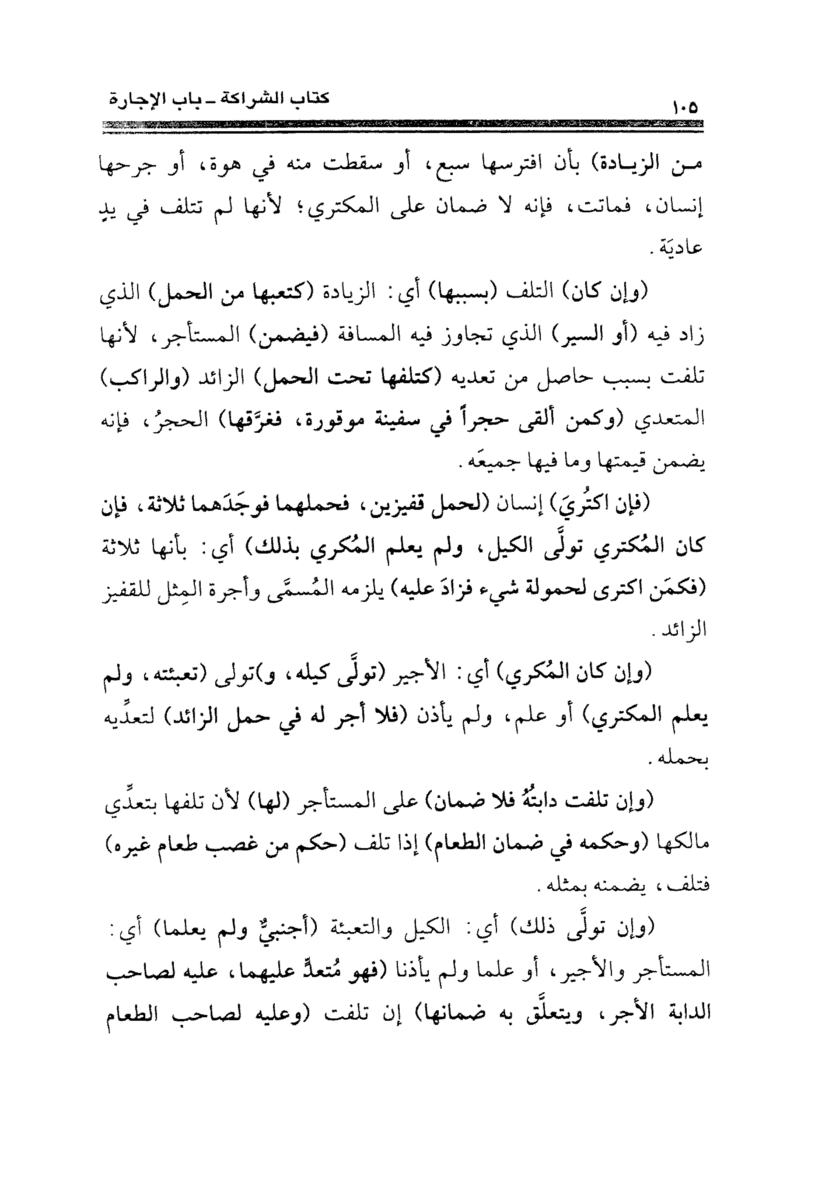 من الزيادة) بأن افترسها سبع، أو سقطت منه في هوة، أو جرحها إنسان، فماتت، فإنه لا ضمان على المكتري؛ لأنها لم تتلف في يدٍ عاديَة.