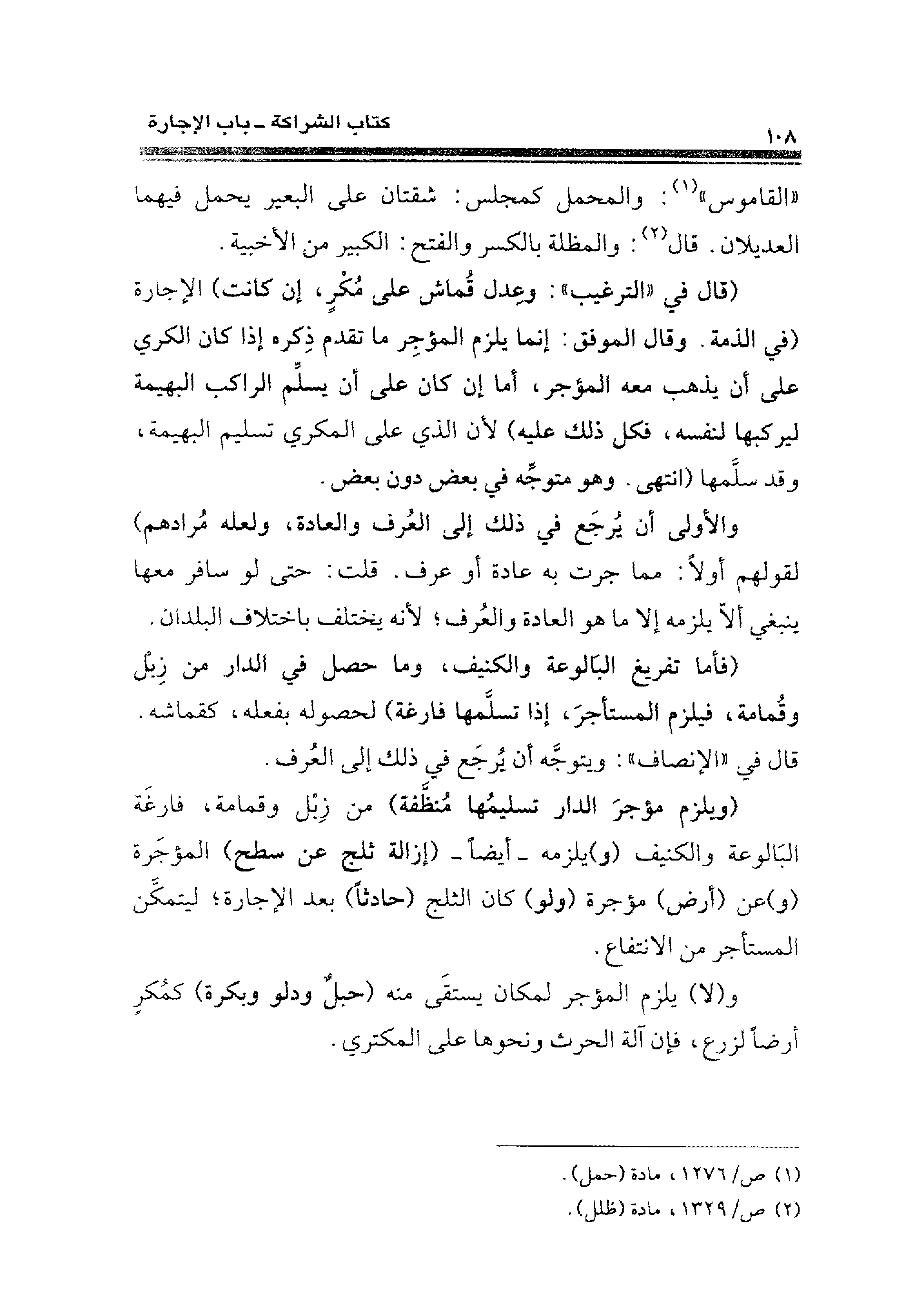 (قال في "الترغيب": وعِدل قُماش على مُكْرٍ، إن كانت) الإجارة (في الذمة. وقال الموفق: إنما يلزم المؤجِر ما تقدم ذِكره إذا كان الكري على أن يذهب معه المؤجر، أما إن كان على أن يسلِّم الراكب البهيمة ليركبها لنفسه، فكل ذلك عليه) لأن الذي على المكري تسلم البهيمة، وقد سلَّمها (انتهى. وهو متوجِّه في بعض دون بعض.