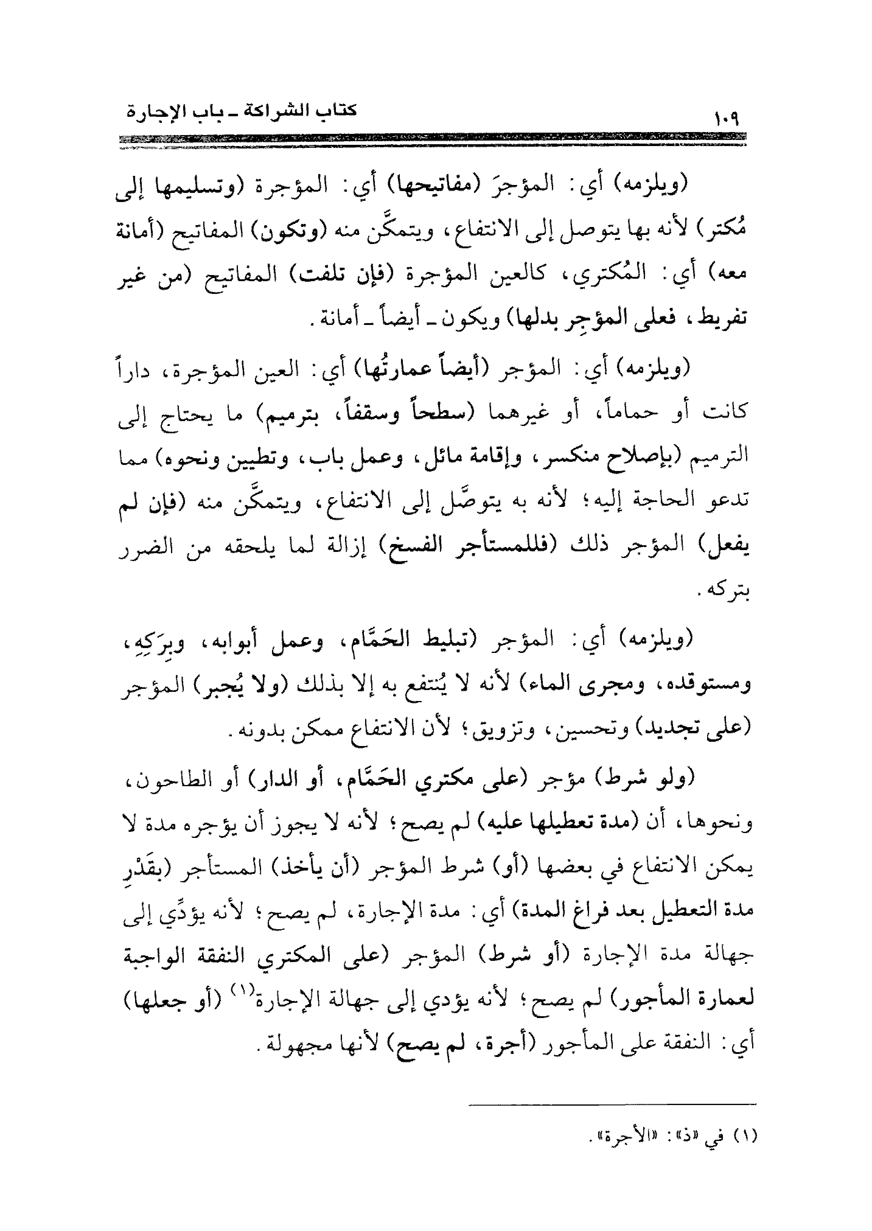 (ولو شرط) مؤجر (على مكتري الحَمَّام، أو الدار) أو الطاحون، ونحوها، أن (مدة تعطيلها عليه) لم يصح؛ لأنه لا يجوز أن يؤجره مدة لا يمكن الانتفاع في بعضها (أو) شرط المؤجر (أن يأخذ) المستأجر (بقَدْرِ مدة التعطيل بعد فراغ المدة) أي. مدة الإجارة؛ لم يصح؛ لأنه يؤدِّي إلى جهالة مدة الإجارة (أو شرط) المؤجر (على المكتري النفقة الواجبة لعمارة المأجور) لم يصح؛ لأنه يؤدي إلى جهالة الإجارة (¬١) (أو جعلها) أي: النفقة على المأجور (أجرة، لم يصح) لأنها مجهولة.