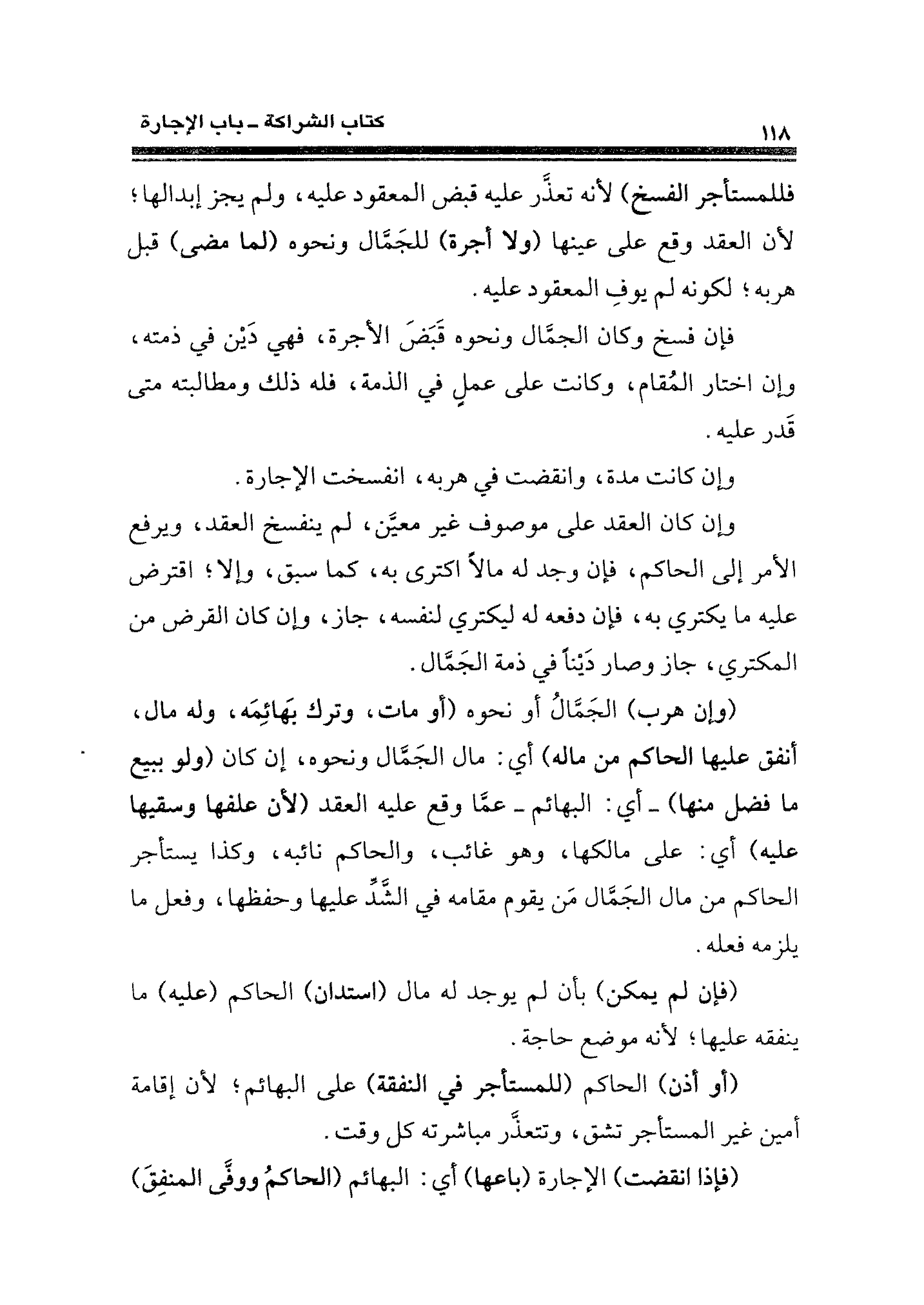 وإن كان العقد على موصوف غير معيَّن، لم ينفسخ العقد، ويرفع الأمر إلى الحاكم، فإن وجد له مالًا اكترى به، كما سبق، وإلا؛ اقترض عليه ما يكتري به، فإن دفعه له ليكتري لنفسه، جاز، وإن كان القرض من المكتري، جاز وصار دَينًا في ذمة الجَمَّال.
