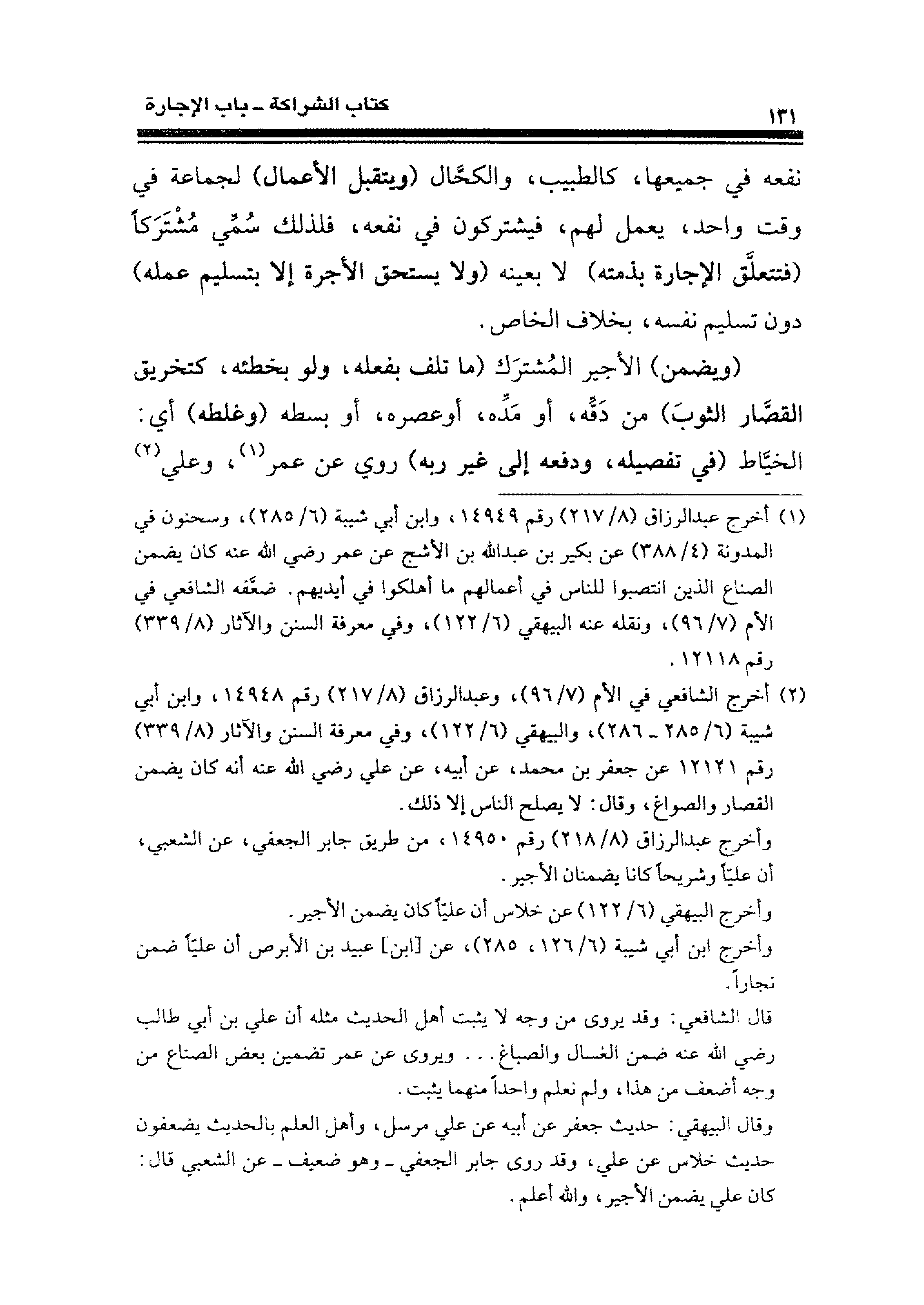 (¬١) أخرج عبد الرزاق (٨/ ٢١٧) رقم ١٤٩٤٩، وابن أبي شيبة (٦/ ٢٨٥)، وسحنون في المدونة (٤/ ٣٨٨) عن بكير بن عبد الله بن الأشج عن عمر رضي الله عنه كان يضمن الصناع الذين انتصبوا للناس في أعمالهم ما أهلكوا في أيديهم. ضعَّفه الشافعي في الأم (٧/ ٩٦)، ونقله عنه البيهقي (٦/ ١٢٢)، وفي معرفة السنن والآثار (٨/ ٣٣٩) رقم ١٢١١٨.