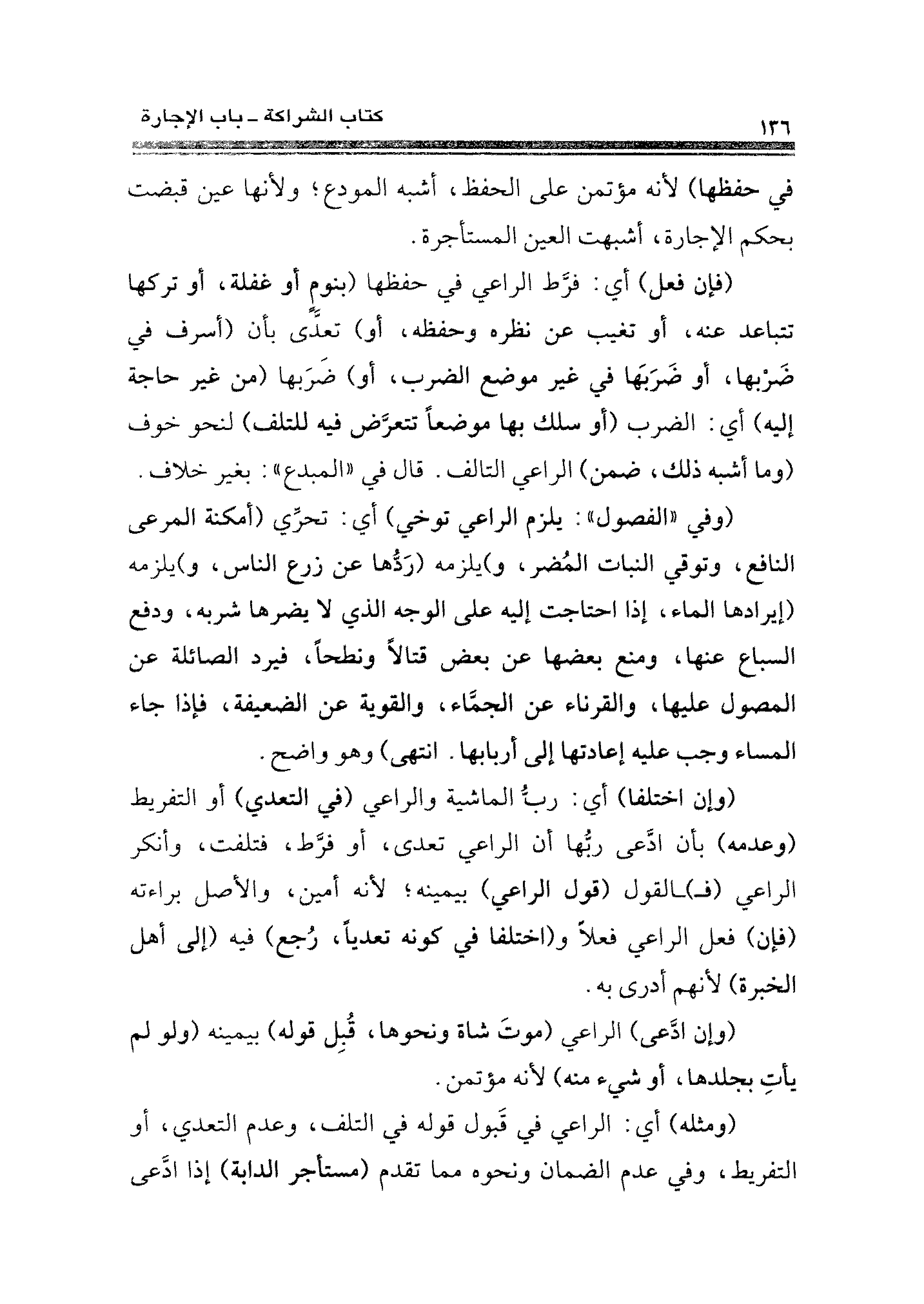 (وفي "الفصول": يلزم الراعي توخي) أي: تحرِّي (أمكنة المرعى النافع، وتوقي النبات المُضر، و) يلزمه (رَدُّها عن زرع الناس، و) يلزمه (إيرادها الماء، إذا احتاجت إليه على الوجه الذي لا يضرها شربه، ودفع السباع منها، ومنع بعضها عن بعض قتالًا ونطحًا، فيرد الصائلة عن المصول عليها، والقرناء عن الجمَّاء، والقوية عن الضعيفة، فإذا جاء المساء وجب عليه إعادتها إلى أربابها. انتهى) وهو واضح.