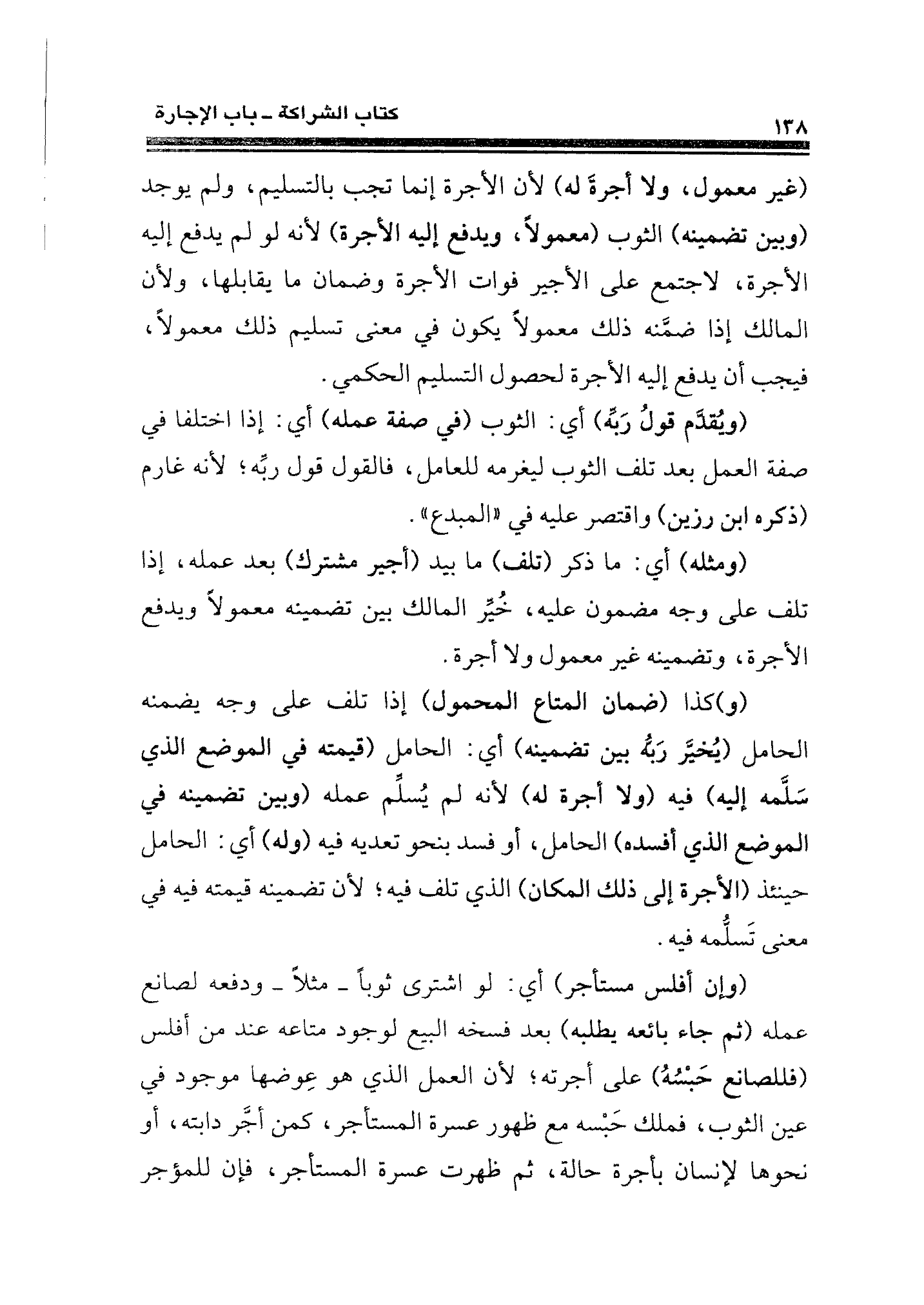 (ويُقدَّم قولُ رَبِّه) أي: الثوب (في صفة عملة) أي: إذا اختلفا في صفة العمل بعد تلف الثوب ليغرمه للعامل، فالقول قول ربِّه؛ لأنه غارم (ذكره ابن رزين) واقتصر عليه في "المبدع".