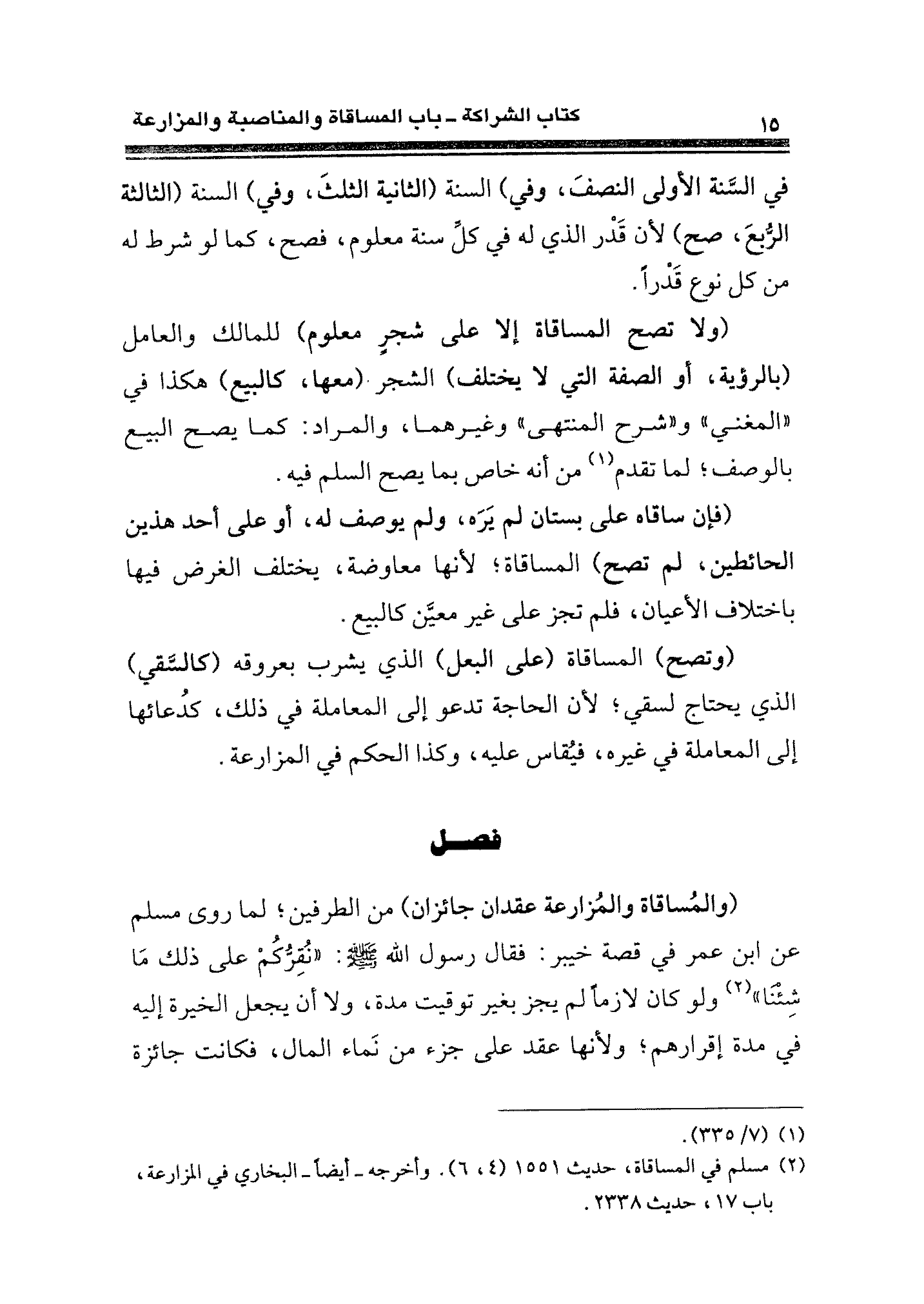 (والمُساقاة والمُزارعة عقدان جائزان) من الطرفين؛ لما روى مسلم عن ابن عمر في قصة خيبر: فقال رسول الله - صلى الله عليه وسلم -: "نُقِرُّكُمْ على ذلك مَا شِئْنَا" (¬٢) ولو كان لازمًا لم يجز بغير توقيت مدة، ولا أن يجعل الخيرة إليه في مدة إقرارهم؛ ولأنها عقد على جزء من نَماء المال، فكانت جائزة