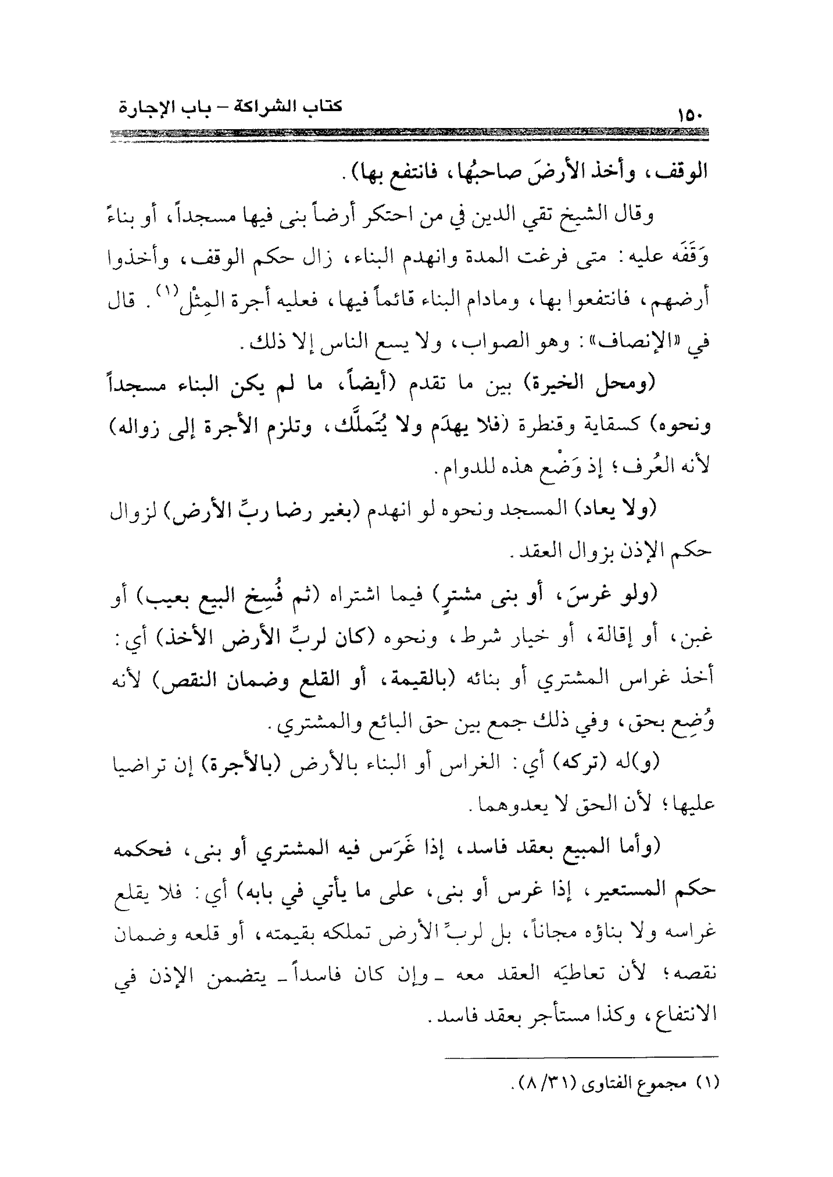وقال الشيخ تقي الدين في من احتكر أرضًا بنى فيها مسجدًا، أو بناءً وَقَفَه عليه: متى فرغت المدة وانهدم البناء، زال حكم الوقف، وأخذوا أرضهم، فانتفعوا بها، وما دام البناء قائمًا فيها، فعليه أجرة المِثْل (¬١). قال في "الإنصاف": وهو الصواب، ولا يسع الناس إلا ذلك.
