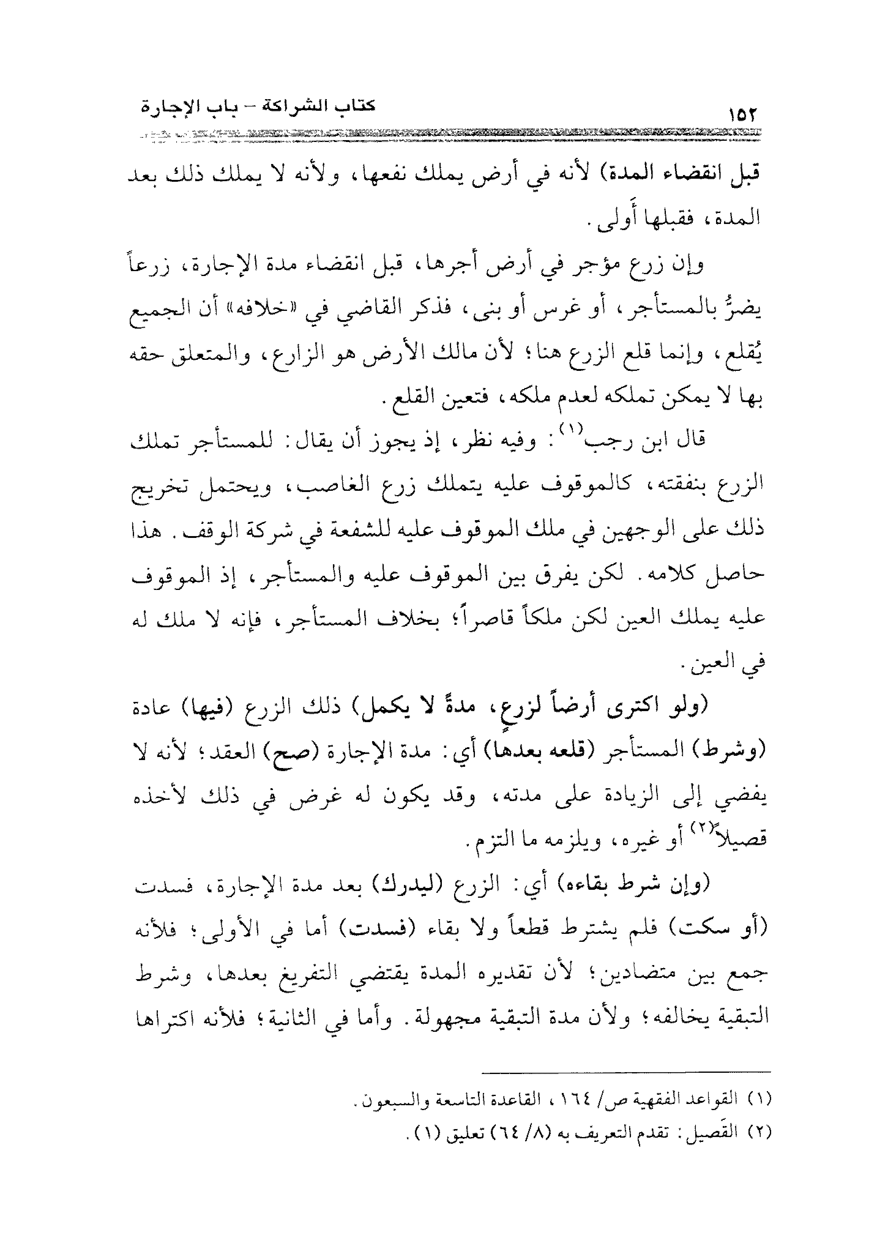 قال ابن رجب (¬١): وفيه نظر، إذ يجوز أن يقال: للمستأجر تملك الزرع بنفقته، كالموقوف عليه يتملك زرع الغاصب، ويحتمل تخريج ذلك على الوجهين في ملك الموقوف عليه للشفعة في شركة الوقف. هذا حاصل كلامه. لكن يفرق بين الموقوف عليه والمستأجر، إذ الموقوف عليه يملك العين لكن ملكًا قاصرًا؛ بخلاف المستأجر، فإنه لا ملك له في العين.
