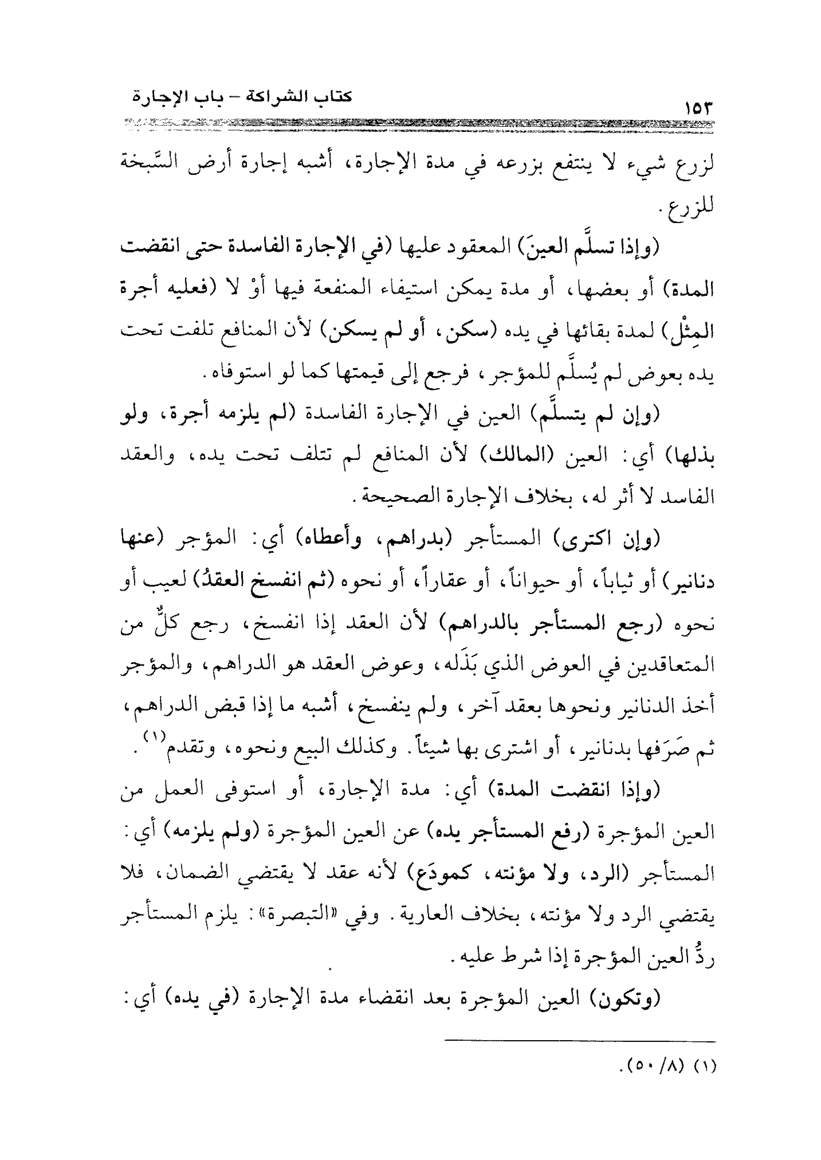 (وإذا انقضت المدة) أي: مدة الإجارة، أو استوفى العمل من العين المؤجرة (رفع المستأجر يده) عن العين المؤجرة (ولم يلزمه) أي: المستأجر (الرد، ولا مؤنته، كمودَع) لأنه عقد لا يقتضي الضمان، فلا يقتضي الرد ولا مؤنته، بخلاف العارية. وفي "التبصرة": يلزم المستأجر ردُّ العين المؤجرة إذا شرط عليه.