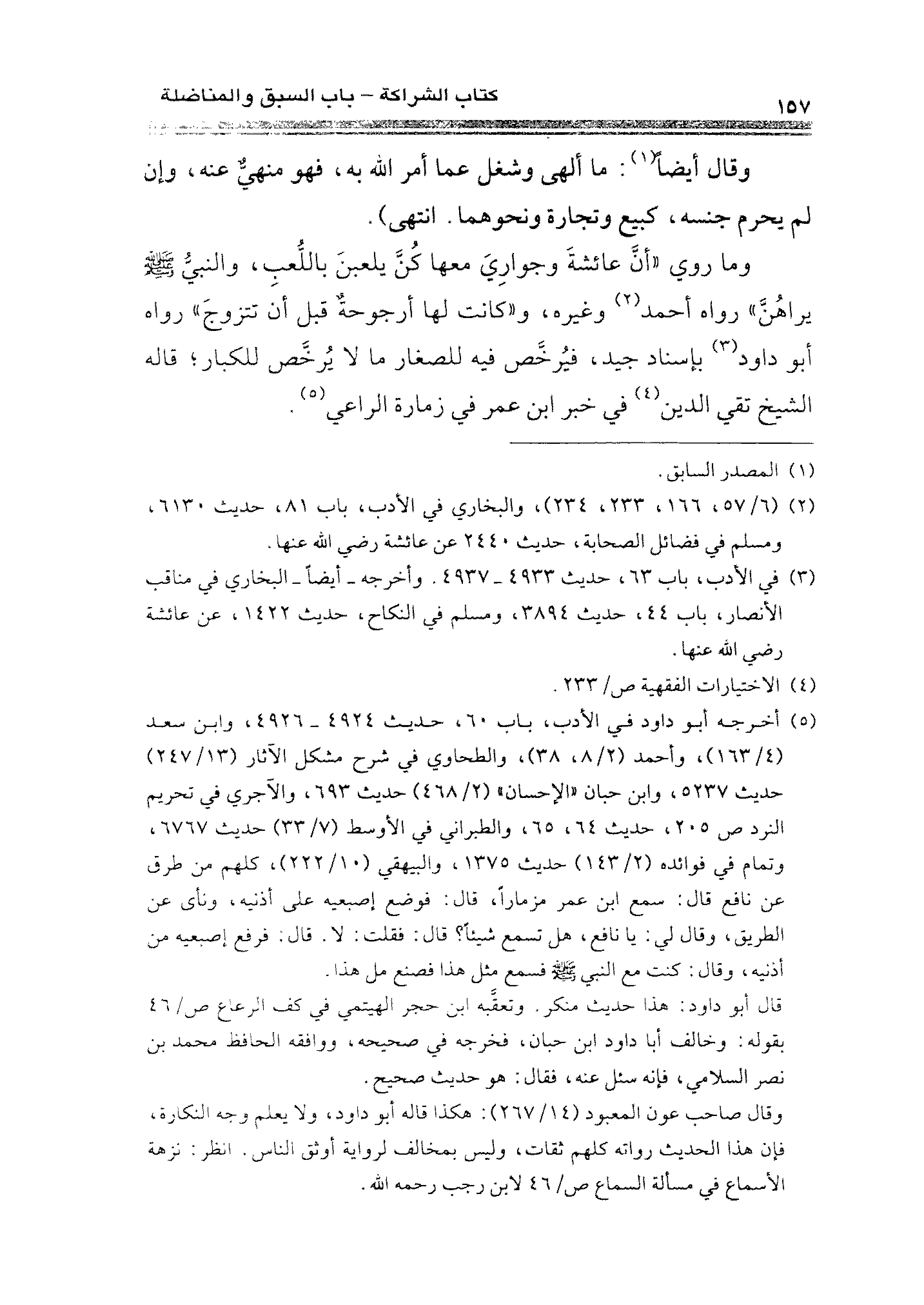 وما روي "أنَّ عائشةَ وجوارِيَ معها كُنَّ يلعبنَ باللُّعبِ، والنبيُّ - صلى الله عليه وسلم - يراهُنَّ" رواه أحمد (¬٢) وغيره، و"كانت لها أرجوحةٌ قل أن تتزوجَ" رواه أبو داود (¬٣) بإسناد جيد، فيُرخَّص فيه للصغار ما لا يُرخَّص للكبار؛ قاله الشيخ تقي الدين (¬٤) في خبر ابن عمر في زمارة الراعي (¬٥).