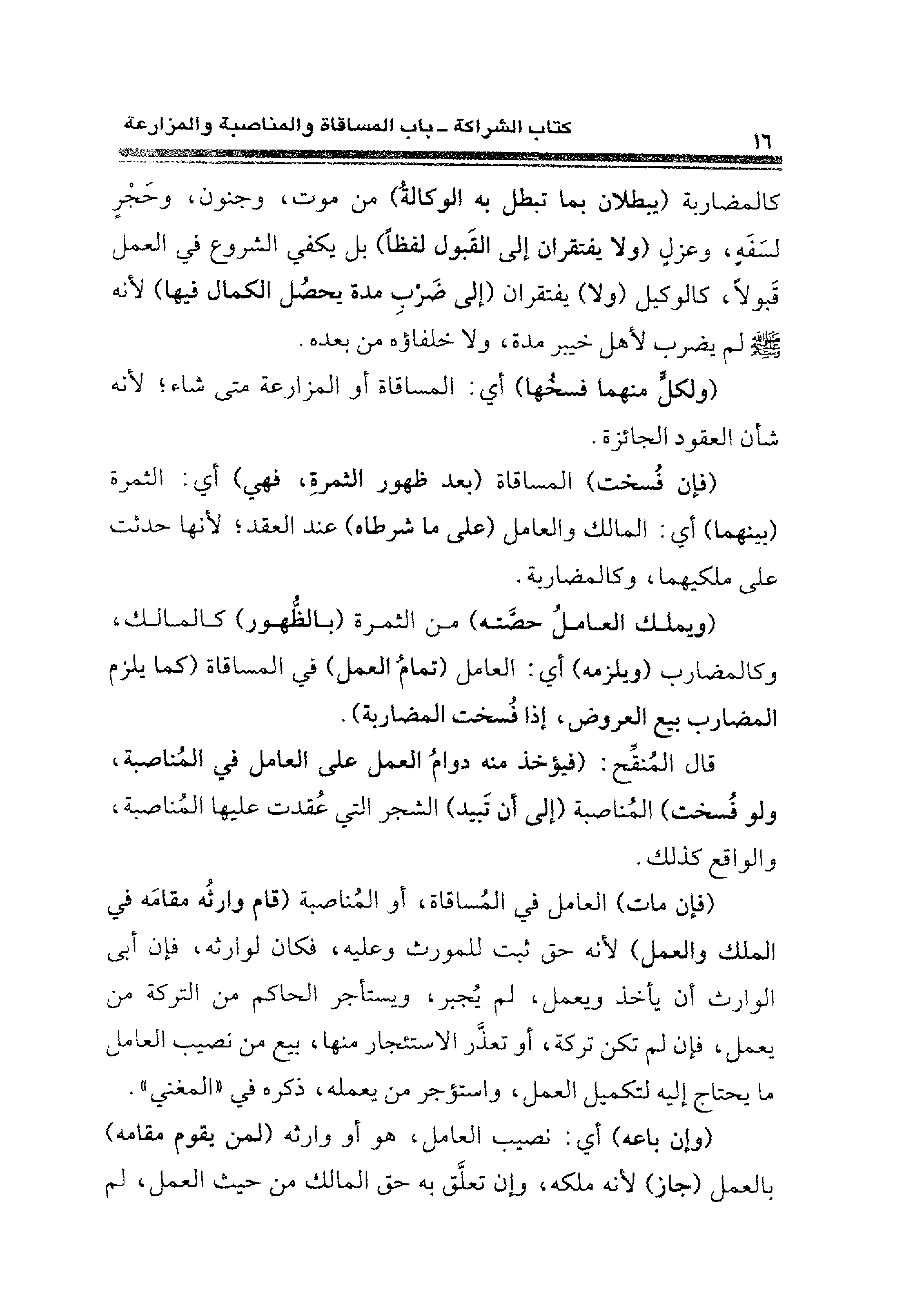 قال المُنقِّح: (فيؤخذ منه دوامُ العمل على العامل في المُناصبة، ولو فُسخت) المناصبة (إلى أن تَبيد) الشجر التي عُقدت عليها المُناصبة، والواقع كذلك.