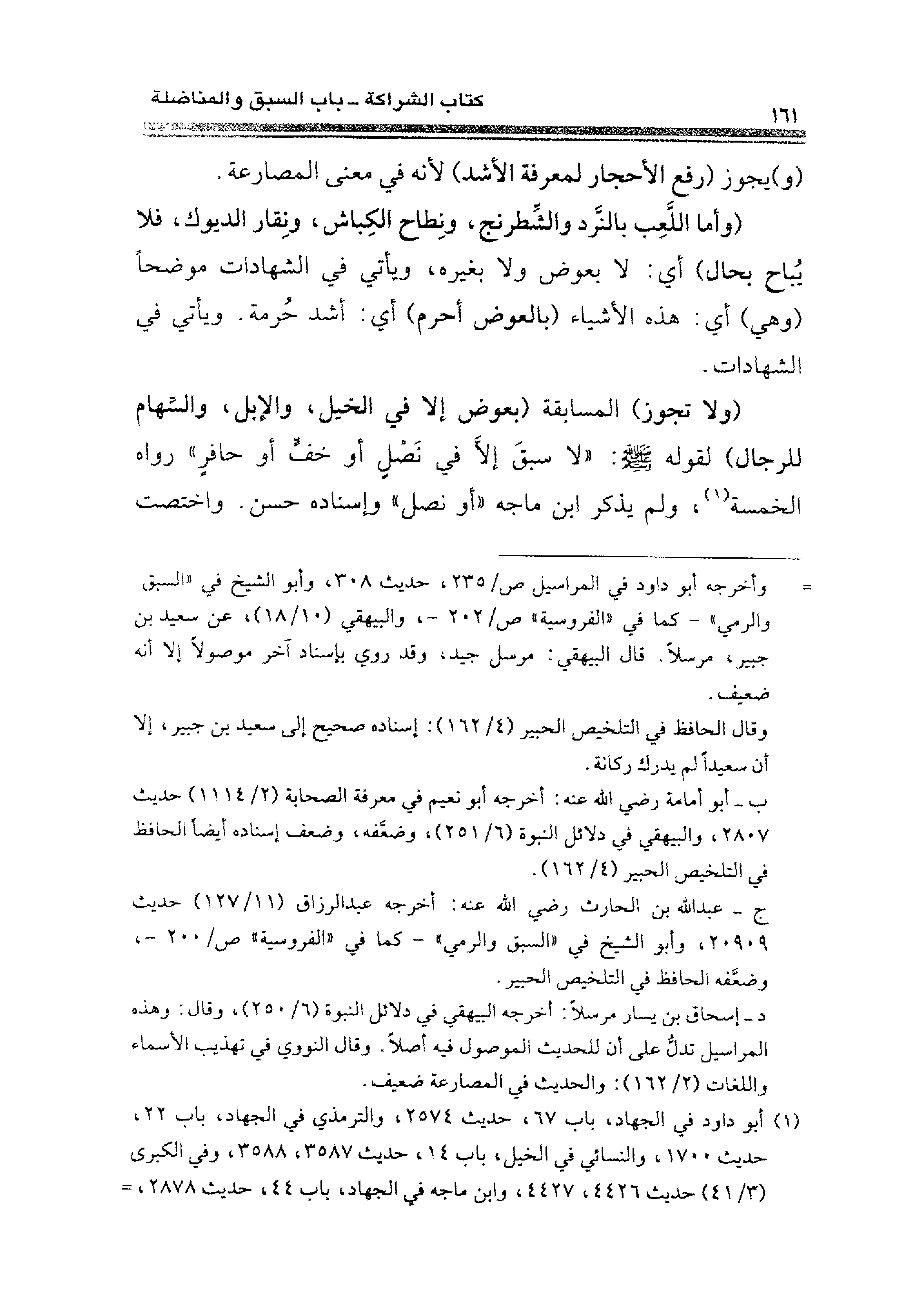 (ولا تجوز) المسابقة (بعوض إلا في الخيل، والإبل، والسِّهام للرجال) لقوله - صلى الله عليه وسلم -: "لا سبقَ إلا في نَصْلٍ أو خفٍّ أو حافرٍ" رواه الخمسة (¬١)، ولم يذكر ابن ماجة: "أو نصل" وإسناده حسن. واختصت
