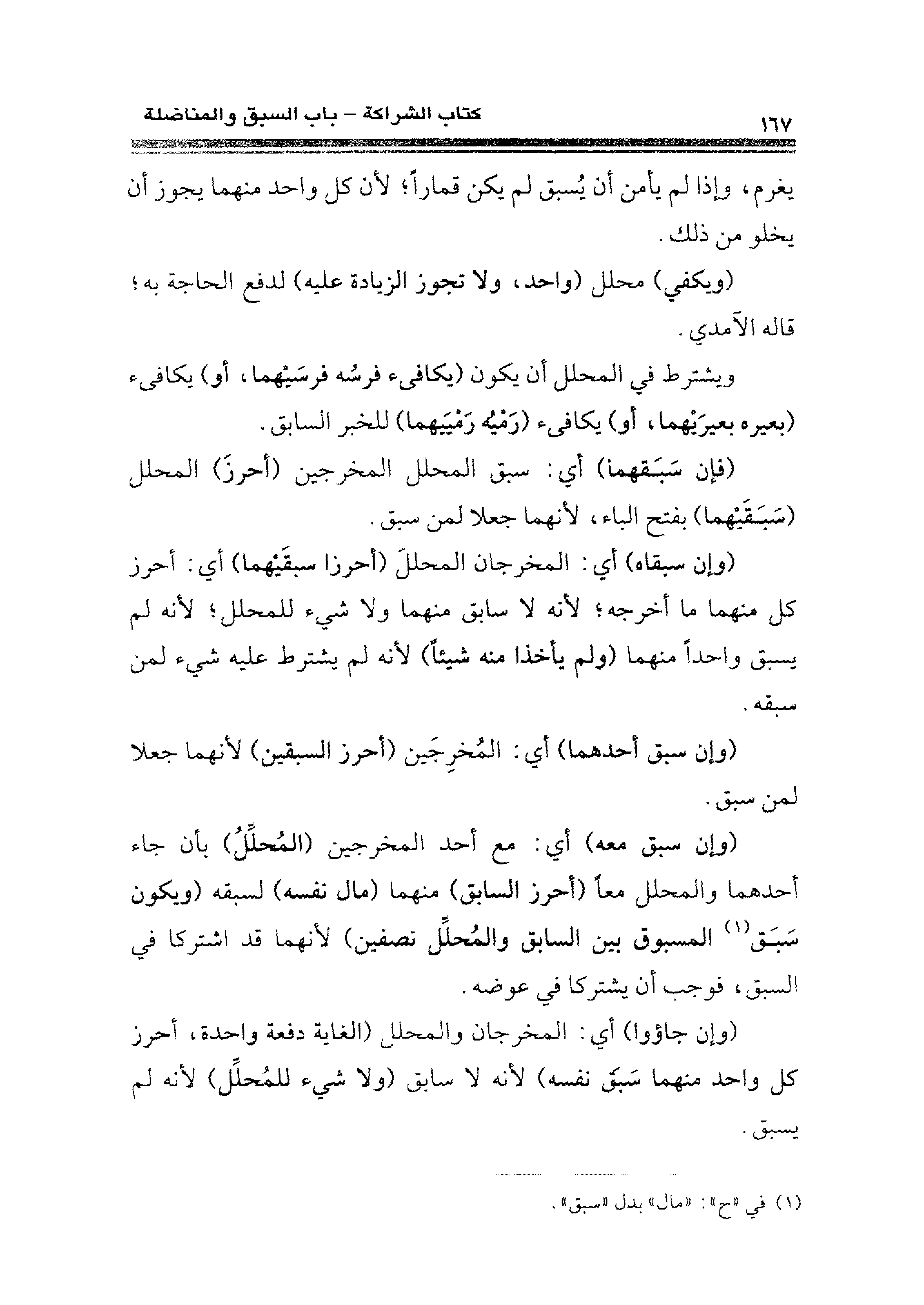 (وإن سبق معه) أي: مع أحد المخرجين (المُحلِّلُ) بأن جاء أحدهما والمحلل معًا (أحرز السابق) منهما (مال نفسه) لسبقه (ويكون سَبَق (¬١) المسبوق بين السابق والمُحلِّل نصفين) لأنهما قد اشتركا في السبق، فوجب أن يشتركا في عوضه.