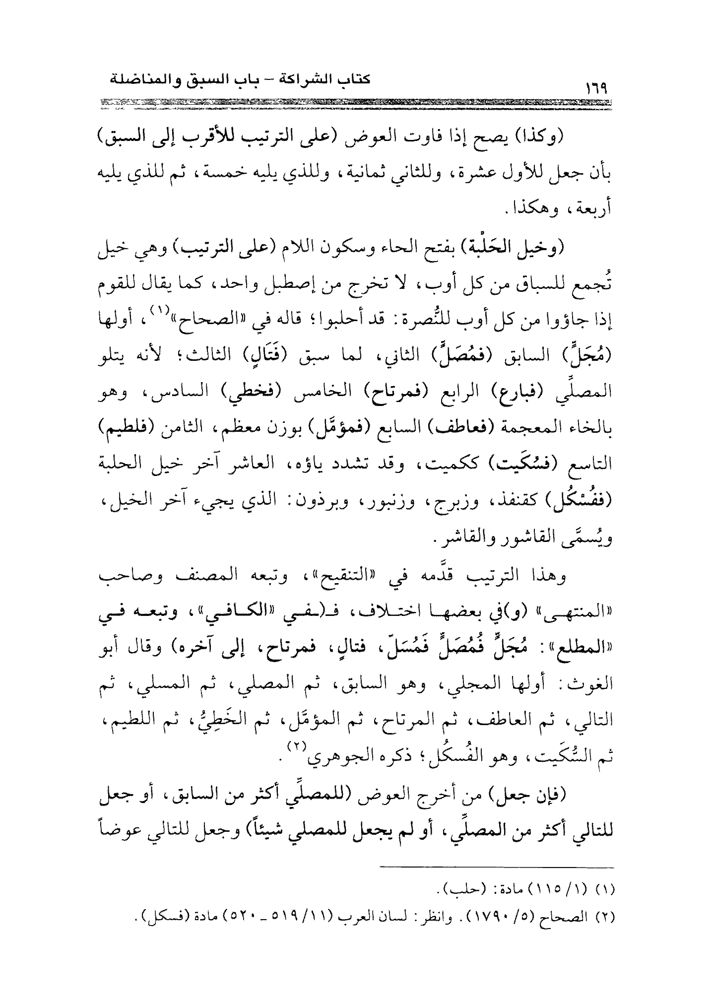 وهذا الترتيب قدَّمه في "التنقيح"، وتبعه المصنف وصاحب "المنتهى" (و) في بعضها اختلاف، فـ (ـفي "الكافي"، وتبعه في "المطلع": مُجَلٍّ فمُصَلٍّ فَمُسَلٍّ، فتالٍ، فمرتاح، إلى آخره) وقال أبو الغوث: أولها المجلي، وهو السابق، ثم المصلي، ثم المسلي، ثم التالي، ثم العاطف، ثم المرتاح، ثم المؤمَّل، ثم الخَطِيُّ، ثم اللطيم، ثم السُّكَيت، وهو الفُسكُل؛ ذكره الجوهري (¬٢).