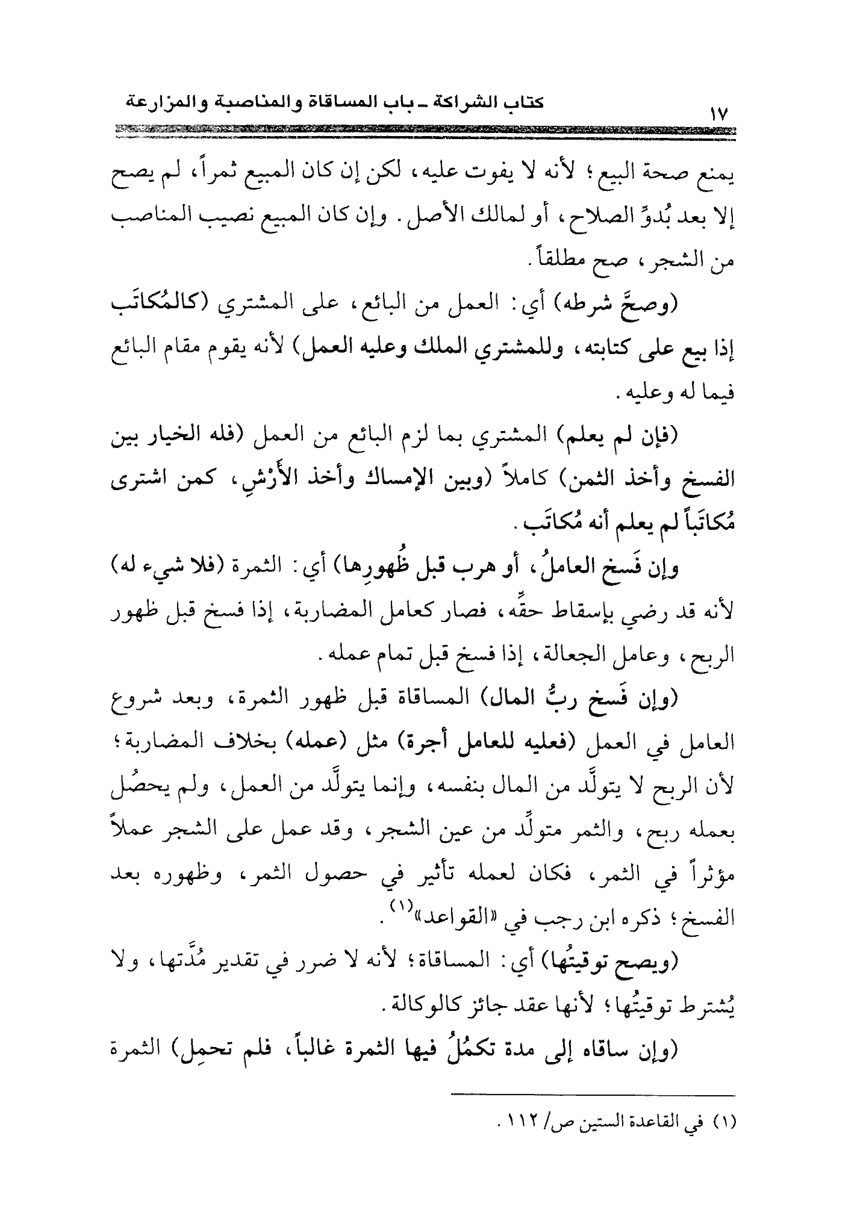 (ويصح توقيتُها) أي: المساقاة؛ لأنه لا ضرر في تقدير مُدَّتها، ولا يُشترط توقيتُها؛ لأنها عقد جائز كالوكالة.