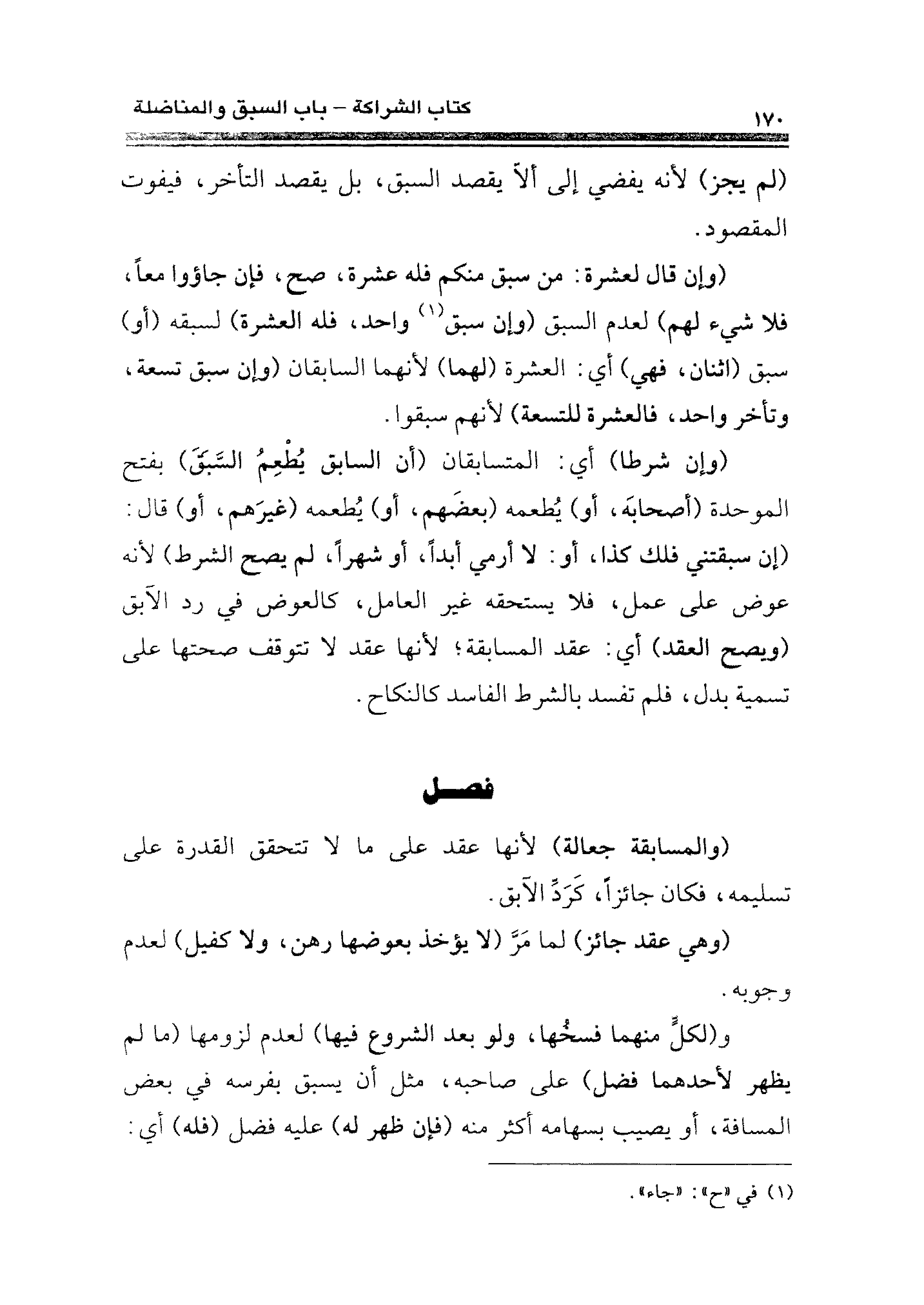 (وإن قال لعشرة: من سبق منكم فله عشرة، صح، فإن جاؤوا معًا، فلا شيء لهم) لعدم السبق (وإن سبق (¬١) واحد، فله العشرة) لسبقه (أو) سبىق (اثنان، فهي) أي: العشرة (لهما) لأنهما السابقان (وإن سبق تسعة، وتأخر واحد، فالعشرة للتسعة) لأنهم سبقوا.