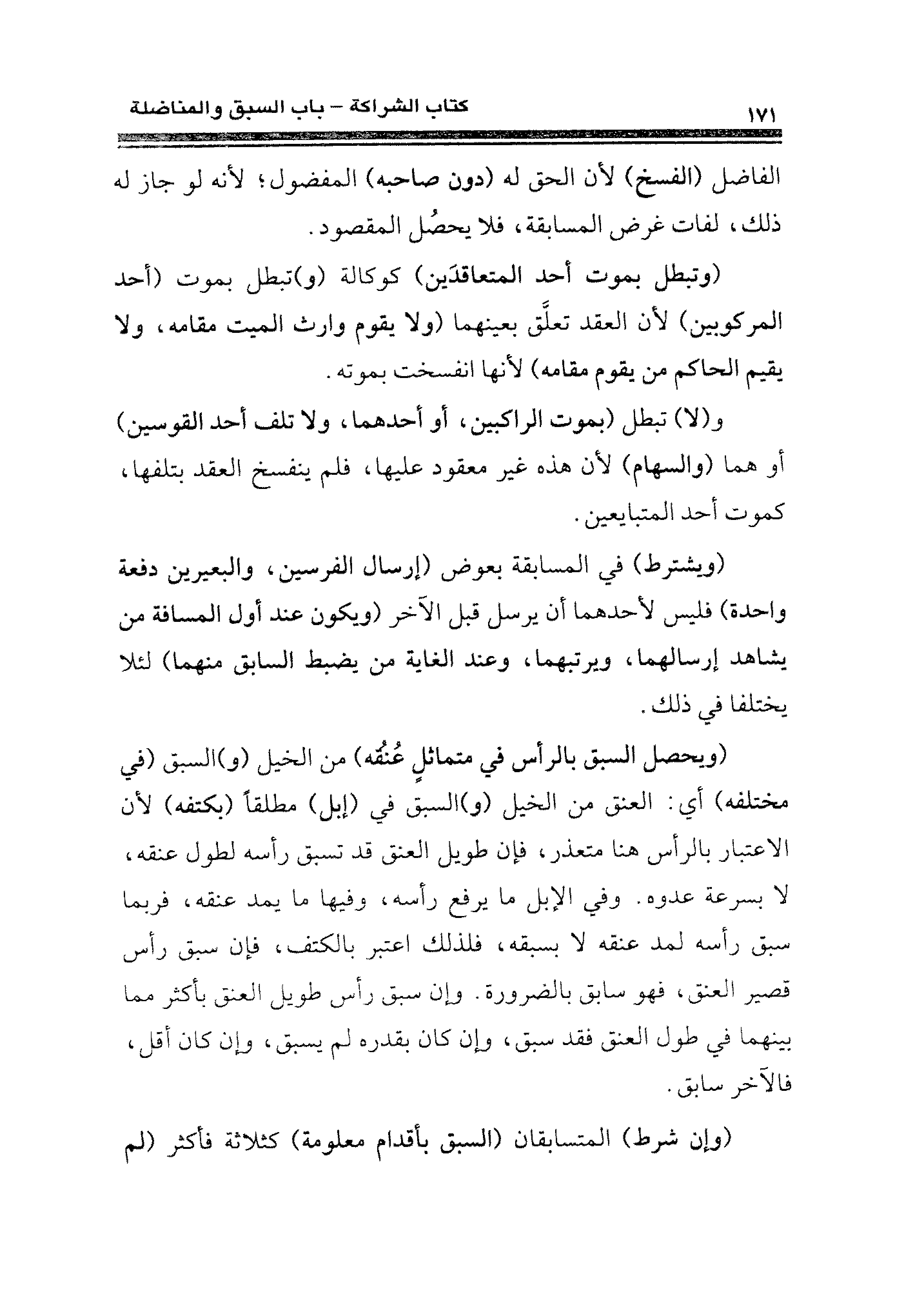 (ويحصل السبق بالرأس في متماثلٍ عُنُقه) من الخيل (و) السبق (في مختلفه) أي: العنق من الخيل (و) السبق في (إبل) مطلقًا (بكتفه) لأن الاعتبار بالرأس هنا متعذر، فإن طويل العنق قد تسبق رأسه لطول عنقه، لا بسرعة عدوه. وفي الإبل ما يرفع رأسه، وفيها ما يمد عنقه، فربما سبق رأسه لمد عنقه لا بسبقه، فلذلك اعتبر بالكتف، فإن سبق رأس قصير العنق، فهو سابق بالضرورة. وإن سبق رأس طويل العنق بأكثر مما بينهما في طول العنق فقد سبق، وإن كان بقدره لم يسبق، وإن كان أقل، فالآخر سابق.