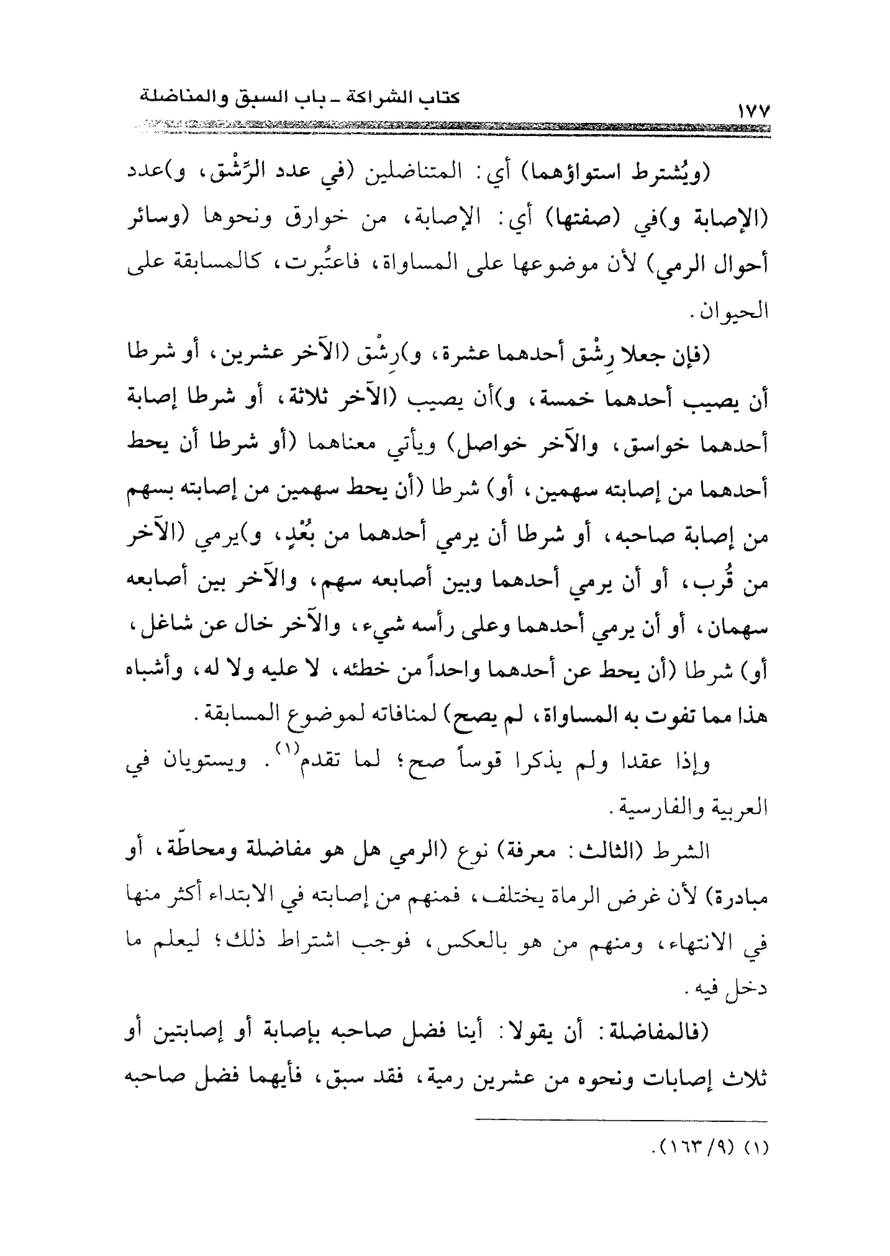 الشرط (الثالث: معرفة) نوع (الرمي هل هو مفاضلة ومحاطّة، أو مبادرة) لأن غرض الرماة يختلف، فمنهم من إصابته في الابتداء أكثر منها في الانتهاء، ومنهم من هو بالعكس، فوجب اشتراط ذلك؛ ليعلم ما دخل فيه.